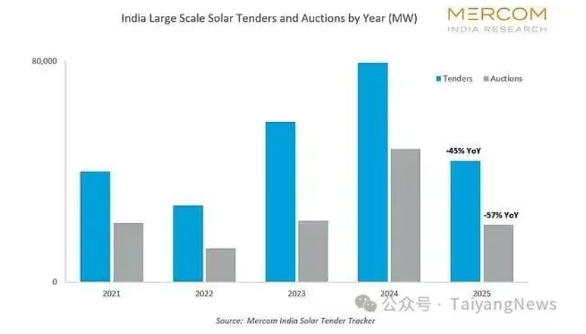 Mercom India Research 的最新報告顯示,印度公用事業(yè)規(guī)模的太陽能項目招標(biāo)活動大幅降溫。招標(biāo)公告量同比下降 45% 至近 44GW,而實際拍賣的容量也下降了 57% 至約 20GW。配電公司(Discoms)對新簽長期購電協(xié)議(PPA)的意愿減弱,以及開發(fā)商面臨的多重執(zhí)行挑戰(zhàn)是主要原因。