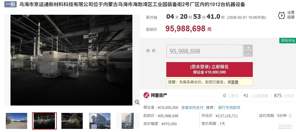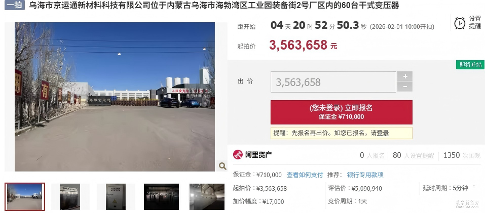 據(jù)悉,阿里拍賣2月1日10點(diǎn)烏海市京運(yùn)通新材料科技有限公司將有兩處資產(chǎn)被拍賣: 根據(jù)拍賣內(nèi)容顯示,1012臺(tái)機(jī)器設(shè)備評(píng)估價(jià)為1.37億元,起拍價(jià)為9598.87萬(wàn)元,保證金為1900萬(wàn)元,加價(jià)幅度為470萬(wàn)元。 60臺(tái)干式變壓器評(píng)估價(jià)為509.09萬(wàn)元,起拍價(jià)為356.37萬(wàn)元,保證金為71萬(wàn)元,加價(jià)幅度為1.7萬(wàn)元。
