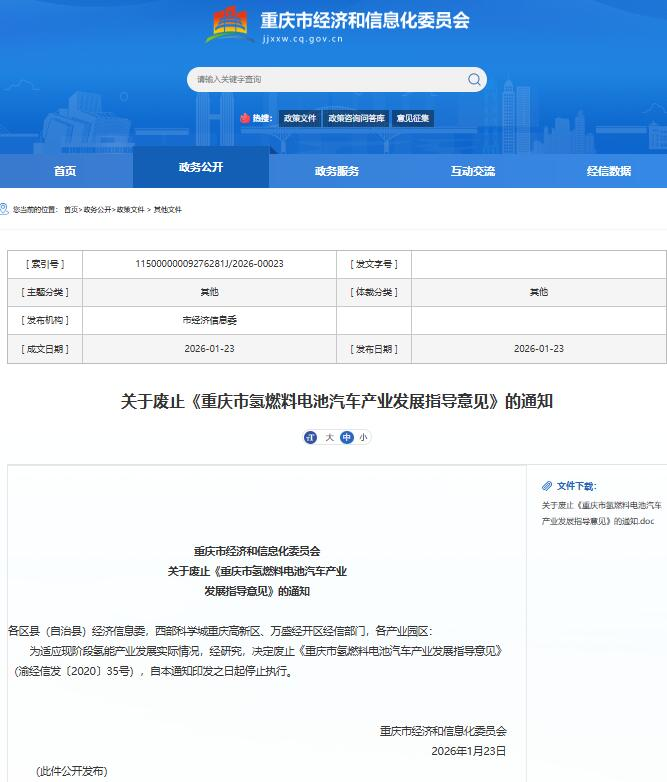 文件稱,為適應(yīng)現(xiàn)階段氫能產(chǎn)業(yè)發(fā)展實(shí)際情況,經(jīng)研究,決定廢止《重慶市氫燃料電池汽車產(chǎn)業(yè)發(fā)展指導(dǎo)意見》(渝經(jīng)信發(fā)〔2020〕35號(hào)),自本通知印發(fā)之日起停止執(zhí)行。