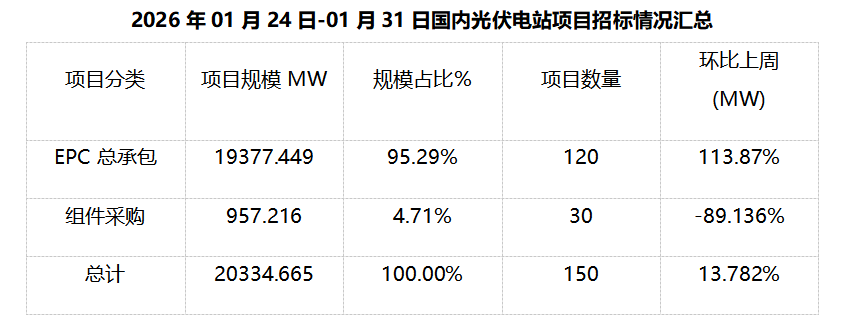 一、光伏項目招標情況匯總: 根據(jù)Gessey蓋錫咨詢統(tǒng)計,2026年01月24日-01月31日累計光伏招標項目為150個,項目規(guī)模合計為20334.665MW。光伏組件采購招標項目為30個,招標規(guī)模為957.216MW,環(huán)比上周-89.136%。EPC總承包招標項目為120個,招標規(guī)模為19377.449MW,環(huán)比上周113.87%。