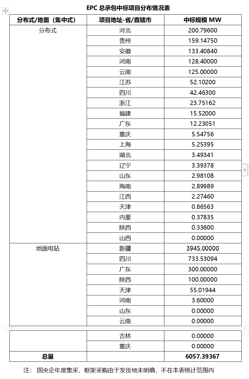 三、EPC總承包及組件采購情況匯總 本月光伏EPC總承包中標規(guī)模達5168.404MW,總中標金額827081.105萬元,平均中標單價為2.817元/W,中標數(shù)量100個。 本月光伏組件采購中標規(guī)模達125.726MW,總中標金額10121.841萬元,平均中標單價為0.744元/W,中標數(shù)量14個。