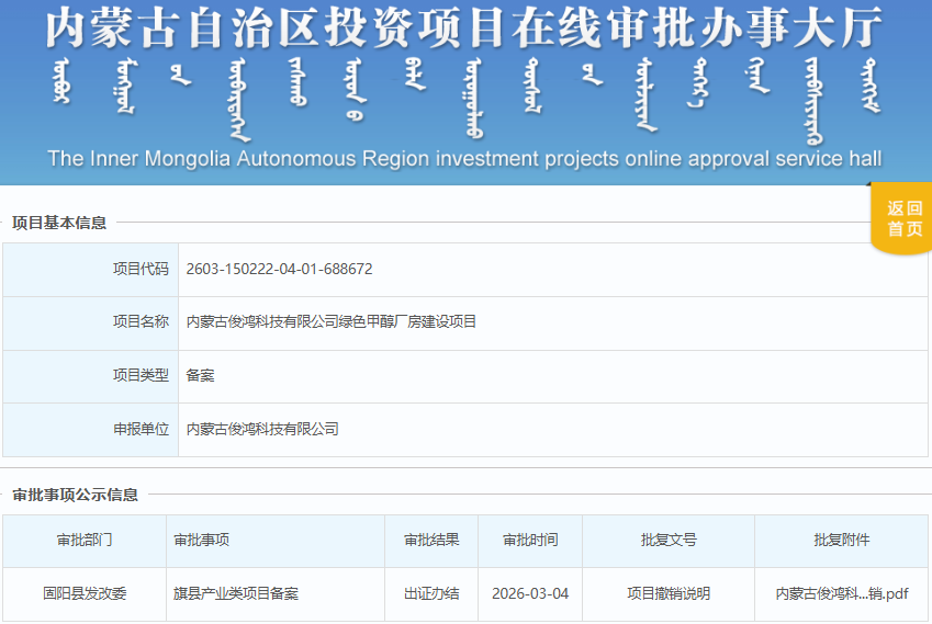 公告稱,內(nèi)蒙古俊鴻科技有限公司2026年3月2日于固陽(yáng)縣發(fā)展和改革委員會(huì)辦理了《內(nèi)蒙古俊鴻科技有限公司綠色甲醇廠房建設(shè)項(xiàng)目》的備案,項(xiàng)目代碼為:2603-150222-04-01-688672,該項(xiàng)目未開工,項(xiàng)目名稱無(wú)法修改,項(xiàng)目單位申請(qǐng)撤銷,經(jīng)審核,同意撤銷該項(xiàng)目。