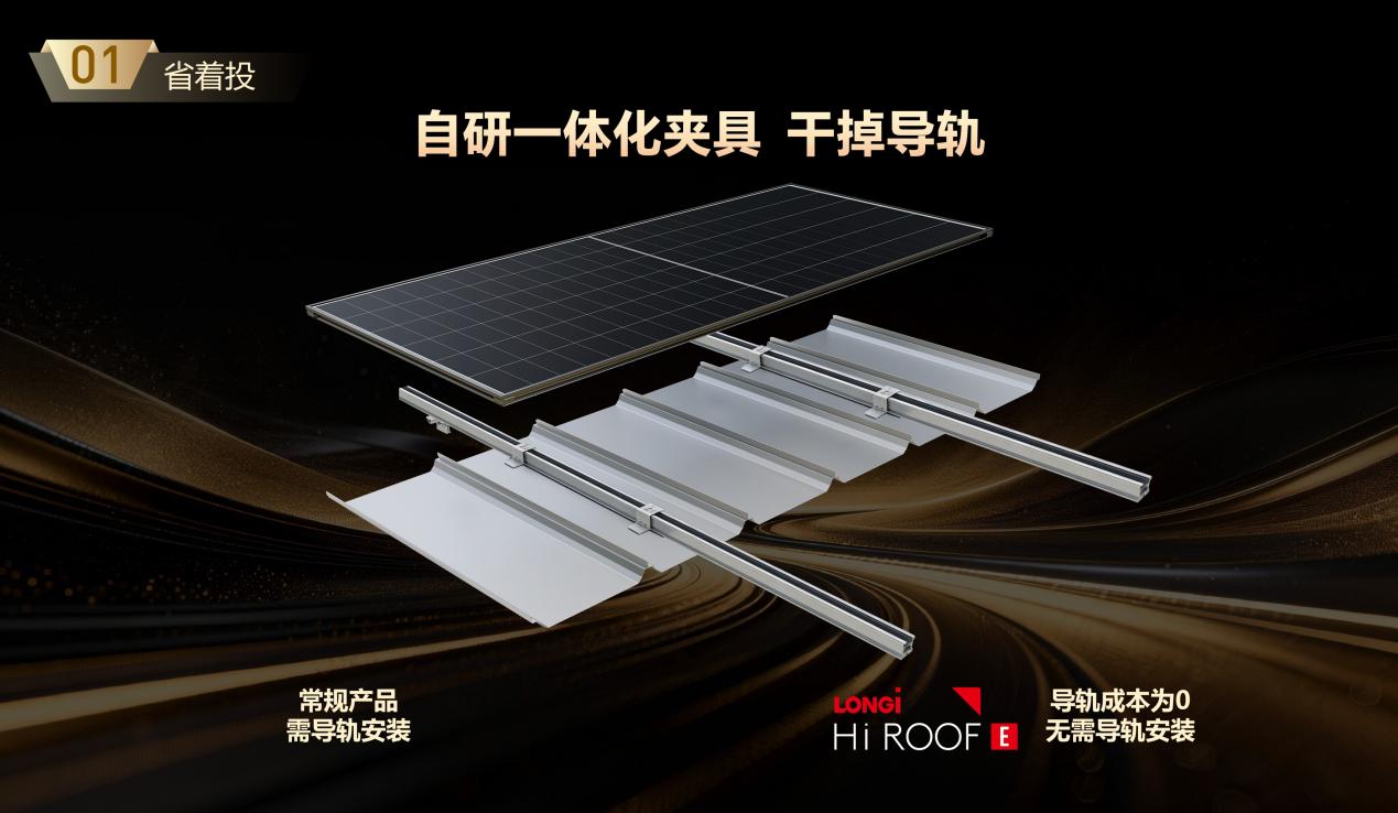 現(xiàn)場(chǎng)還首次公開了在TüV萊茵進(jìn)行的實(shí)況測(cè)試: ·火焰蔓延測(cè)試:組件承受760℃火舌持續(xù)10分鐘直面灼燒,火焰被牢牢鎖定在單個(gè)組件范圍內(nèi),絕不橫向擴(kuò)散。 ·燃燒塊測(cè)試:體積為常規(guī)Class C級(jí)燃?jí)K178倍的巨型燃?jí)K被點(diǎn)燃,防火玻璃巋然不動(dòng),而對(duì)比組件已被燒穿。 國(guó)家光伏質(zhì)檢中心(CPVT)公布的多倍太陽(yáng)光加速測(cè)試結(jié)果顯示:常規(guī)TOPCon組件最高升溫至190℃,出現(xiàn)玻璃爆裂、柵線燒斷;而特種防火組件最高升溫僅140℃,外觀無(wú)異常。 保險(xiǎn)公司的“真金白銀”:費(fèi)率直降5% 市場(chǎng)的最終檢驗(yàn)者是資本。發(fā)布會(huì)上,中國(guó)人保宣布,凡采用Hi-MO X10特種防火組件及三防組件的光伏電站,相比常規(guī)產(chǎn)品費(fèi)率直降5%。 保險(xiǎn)公司愿為這款產(chǎn)品提供真金白銀的優(yōu)惠,是對(duì)其“極致安全”屬性的最強(qiáng)市場(chǎng)化背書。 復(fù)雜屋頂?shù)慕当靖锩篖ONGi Hi ROOF E “干掉導(dǎo)軌” 如果說Hi-MO X10解決的是“安全”問題,那么LONGi Hi ROOF E 系統(tǒng)則回答了另一類行業(yè)難題——復(fù)雜屋頂如何“降本”。 牛燕燕在演講中表示,當(dāng)組件價(jià)格已經(jīng)降無(wú)可降的背景下,系統(tǒng)成本和施工效率正在成為新的競(jìng)爭(zhēng)焦點(diǎn)。 傳統(tǒng)工商業(yè)屋頂安裝需要大量導(dǎo)軌、夾具、螺栓,一個(gè)1MW項(xiàng)目可能涉及近2萬(wàn)個(gè)零部件。其中,導(dǎo)軌本身不發(fā)電,卻要拿走0.08-0.12元/W的系統(tǒng)成本。