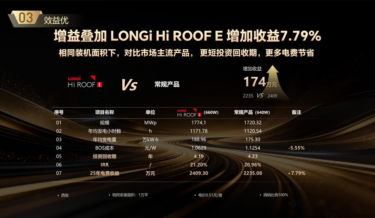 收益測(cè)算顯示,以西安某1萬(wàn)平米工商業(yè)屋頂為例,同樣的屋頂面積,對(duì)比市場(chǎng)最高的640W產(chǎn)品,采用LONGi Hi ROOF E (660W)系統(tǒng),BOS(初始投資成本)成本降低了5.55%,25年可多賺174萬(wàn)元。 光伏競(jìng)爭(zhēng)的新維度:從“價(jià)格”回歸“價(jià)值”