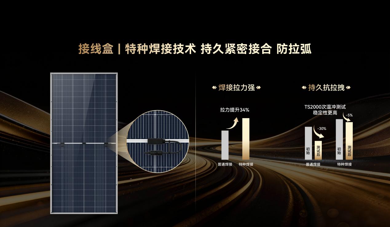 首先,引入特種焊接技術(shù),實(shí)現(xiàn)微米級(jí)高精度焊接,使接線盒的焊點(diǎn)拉力比普通焊接提升34%;經(jīng)2000次極端溫沖測(cè)試后,特種焊接拉力保持率仍在95%以上,而普通焊接衰減高達(dá)30%,從源頭規(guī)避了虛焊導(dǎo)致的拉弧風(fēng)險(xiǎn)。