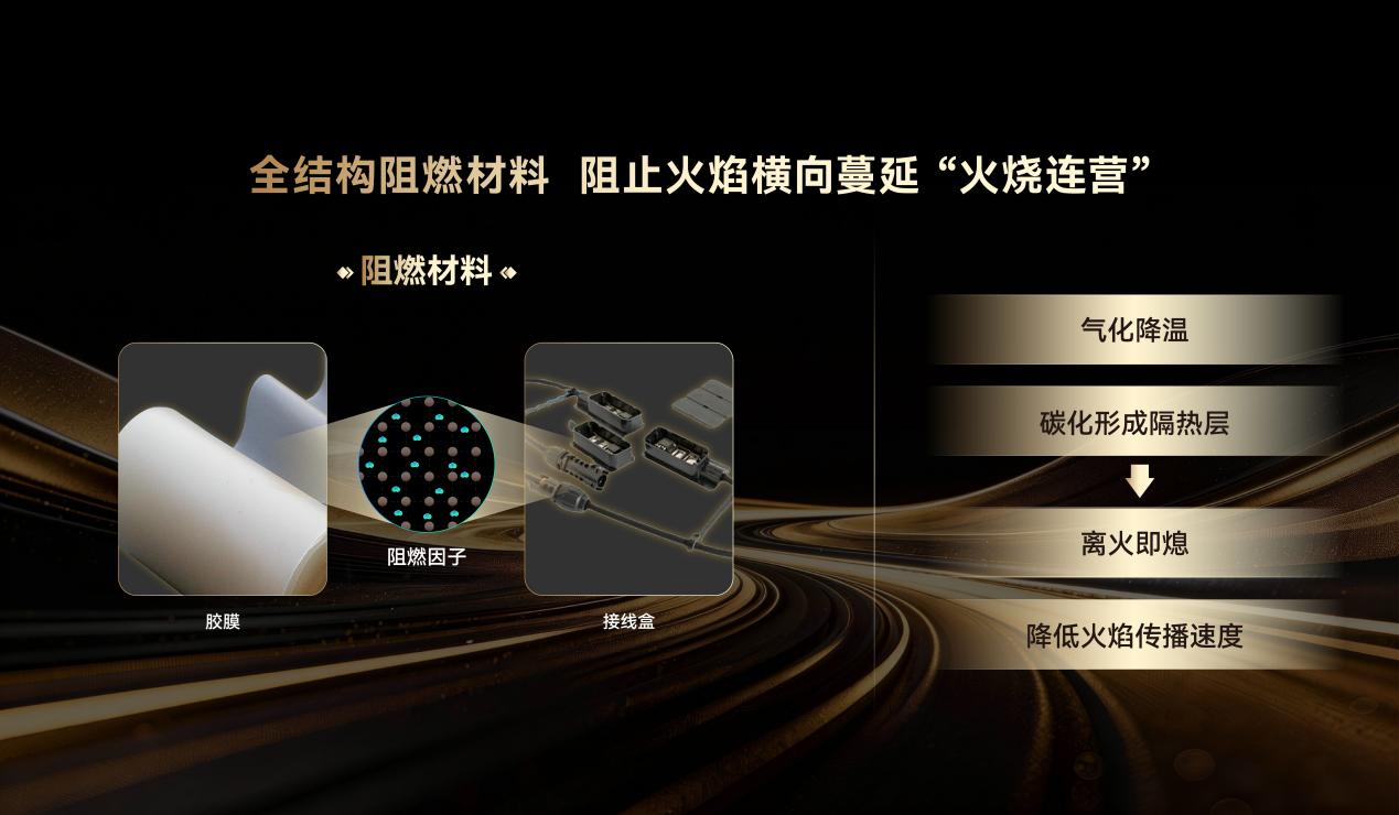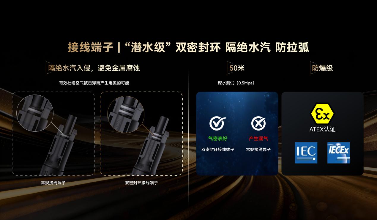 其次,采用 “潛水級(jí)”雙密封環(huán)接線端子。常規(guī)單密封圈端子易因水汽入侵導(dǎo)致腐蝕、接觸不良。Hi-MO X10的雙密封圈結(jié)構(gòu),能有效隔絕水汽、腐蝕性氣體,通過50米水深級(jí)氣密性測(cè)試,并獲得ATEX/IECEx防爆認(rèn)證,從物理上杜絕空氣被擊穿產(chǎn)生電弧的可能。 第二道防線:防蔓延,為極端情況爭(zhēng)取“黃金90分鐘” 解決了組件自身起火,另一個(gè)關(guān)鍵問題是:如果別處起火,組件會(huì)不會(huì)成為“助燃物”?