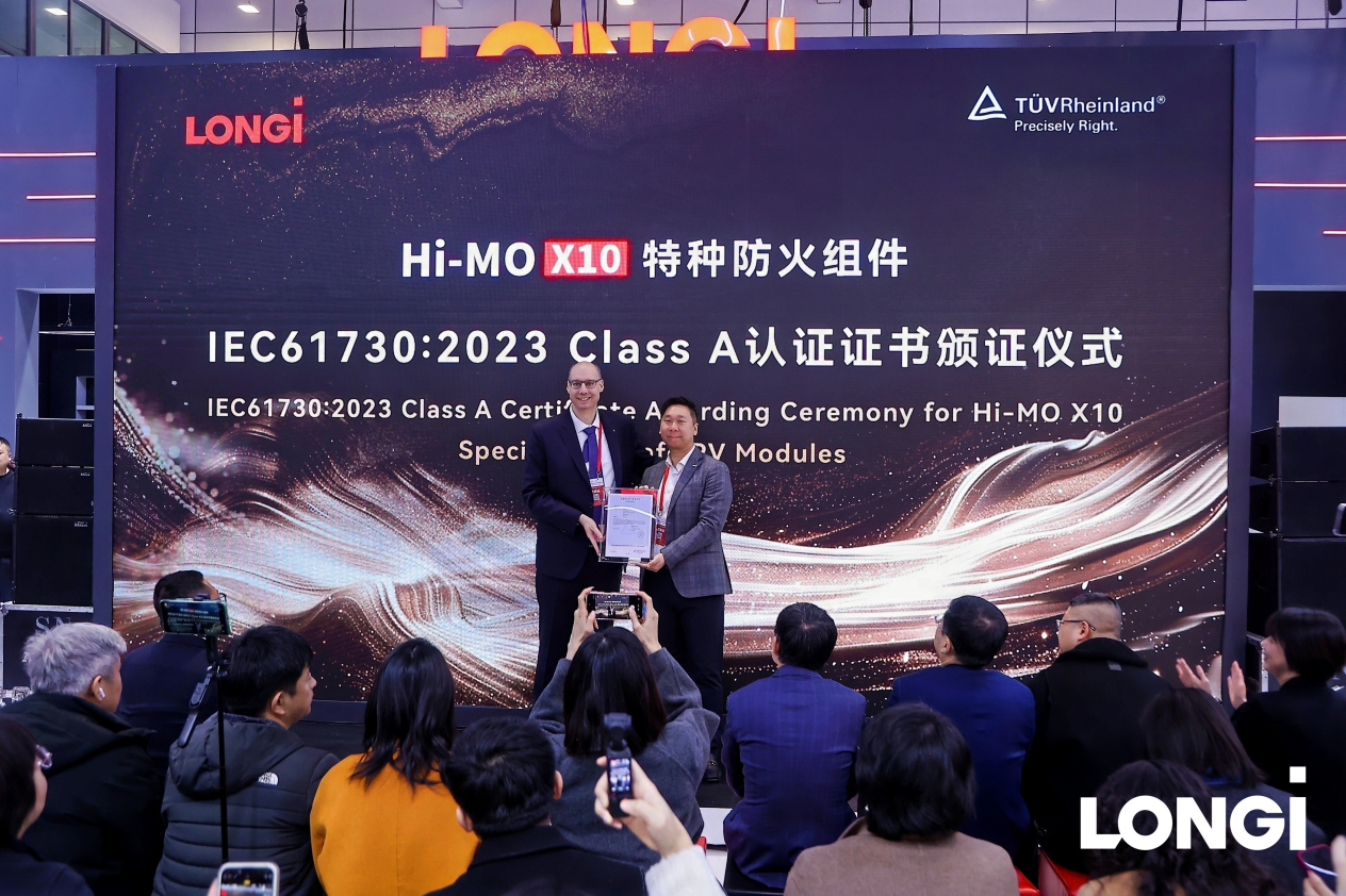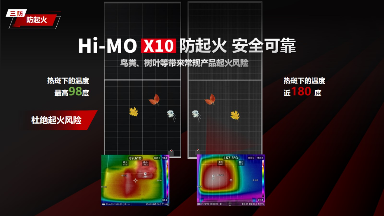 隆基分布式事業(yè)群總裁蔣東宇提到了:“光伏火災(zāi)是典型的“低頻高損”事件——不發(fā)生則已,一旦發(fā)生,一切歸零。安全是‘1’,其他都是‘0’。沒有安全,發(fā)電效率、投資收益都失去意義?!?/span> 一個(gè)來(lái)自“輸不起”的客戶的終極追問 3月9日,在濟(jì)南國(guó)際光儲(chǔ)利用大會(huì)上,隆基推出一款Hi-MO X10特種防火組件。 這款產(chǎn)品故事的起點(diǎn),來(lái)自一個(gè)全球領(lǐng)先的電池制造商。 這家企業(yè)在規(guī)劃全國(guó)各大基地的光伏電站時(shí),向隆基提出了一個(gè)前所未有的要求:“我們的廠房里,是自動(dòng)化產(chǎn)線、化學(xué)原料、正在充放電測(cè)試的電池模組。這里,容不下哪怕一丁點(diǎn)火星?!?/span> 這不是一家企業(yè)的過度謹(jǐn)慎。它撕開了光伏行業(yè)長(zhǎng)期被忽視的一道安全裂縫——現(xiàn)行標(biāo)準(zhǔn),真的足夠安全嗎? 目前光伏行業(yè)沿用的UL790防火標(biāo)準(zhǔn),脫胎于建材行業(yè)。絕大多數(shù)產(chǎn)品僅能滿足最低的Class C級(jí)要求。這意味著,許多光伏組件,其實(shí)只是在“賭”——賭組件自身不起火,賭外部火源不來(lái)。 而這份 “賭徒式” 的安全,終究抵不過現(xiàn)實(shí)風(fēng)險(xiǎn):直流拉弧和熱斑作為光伏起火的核心隱患,始終是行業(yè)未破解的難題。 從根源掐滅“隱患” 本次Hi-MO X10特種防火組件的核心突破,正是直擊這一隱藏殺手,從根源掐滅這道安全隱患,為電站構(gòu)建起兩道不可逾越的安全防線。