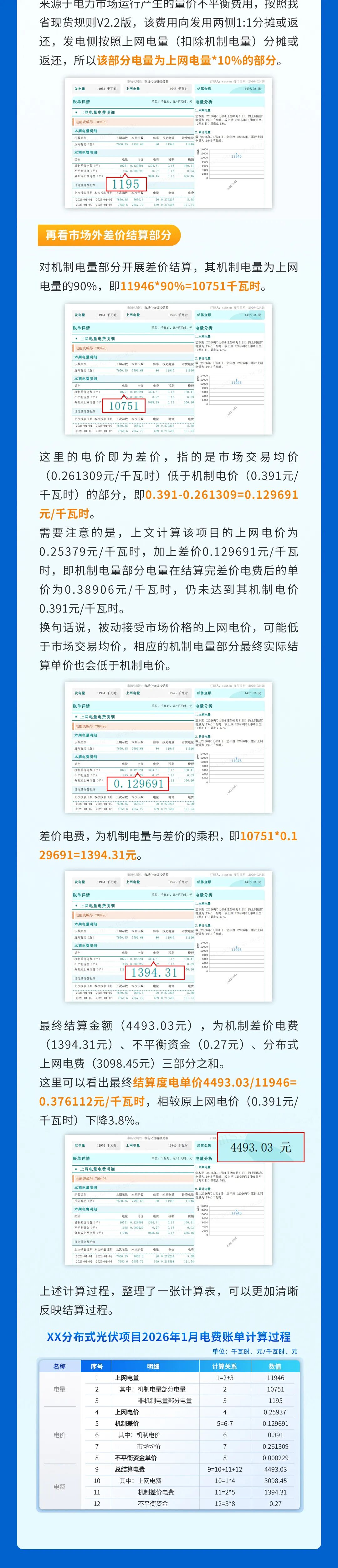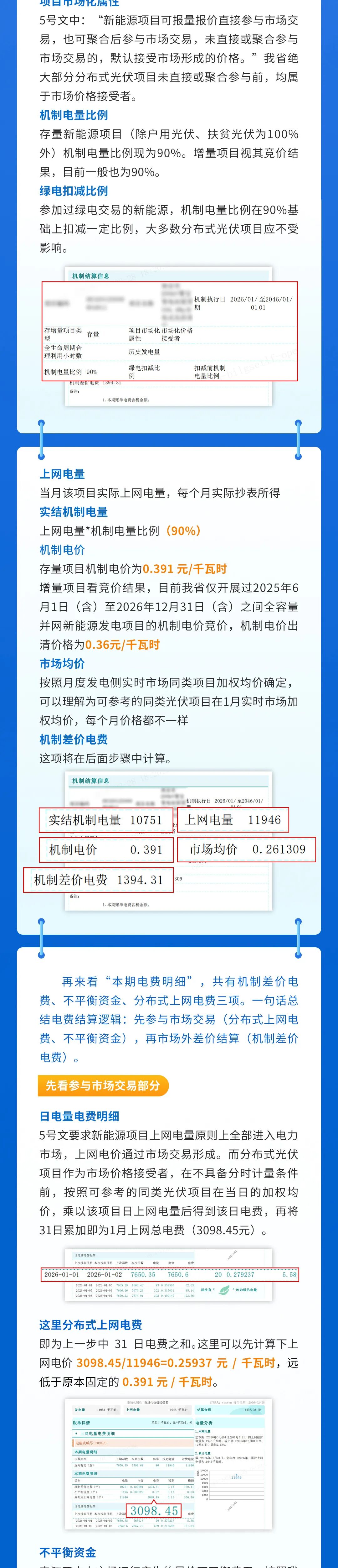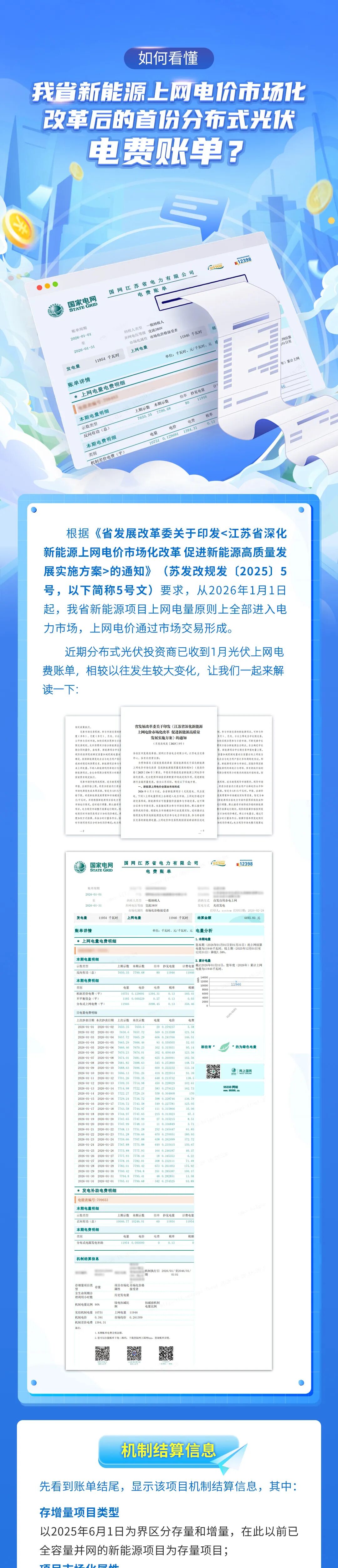 【導(dǎo)讀】2026年1月1日,《江蘇省深化新能源上網(wǎng)電價(jià)市場化改革促進(jìn)新能源高質(zhì)量發(fā)展實(shí)施方案》(蘇發(fā)改規(guī)發(fā) (2025)5號)正式落地,江蘇分布式光伏邁入全量入市新階段,徹底告別0.391元/kWh的固定燃煤基準(zhǔn)價(jià),上網(wǎng)電價(jià)由市場交易形成,同步啟用可持續(xù)發(fā)展價(jià)格結(jié)算機(jī)制。作為政策落地后的首份電費(fèi)賬單,1 月賬單的結(jié)構(gòu)構(gòu)成、計(jì)算邏輯與收益變化,成為廣大光伏項(xiàng)目業(yè)主、運(yùn)維企業(yè)及行業(yè)從業(yè)者的關(guān)注核心 —— 市場化電價(jià)為何遠(yuǎn)低于固定價(jià)?機(jī)制差價(jià)補(bǔ)貼如何核算?不平衡資金分?jǐn)傄?guī)則是什么?最終收益是否有保障?下圖將基于國網(wǎng)江蘇省電力有限公司出具的真實(shí)賬單數(shù)據(jù),拆解電量分類、費(fèi)用構(gòu)成、結(jié)算邏輯三大核心要點(diǎn),通過具體數(shù)值演算還原每一筆收入的來龍去脈,清晰解讀存量與增量項(xiàng)目的機(jī)制差異,幫助讀者快速掌握入市后電費(fèi)結(jié)算的關(guān)鍵規(guī)則,為后續(xù)項(xiàng)目收益核算、市場交易決策提供實(shí)用指引。