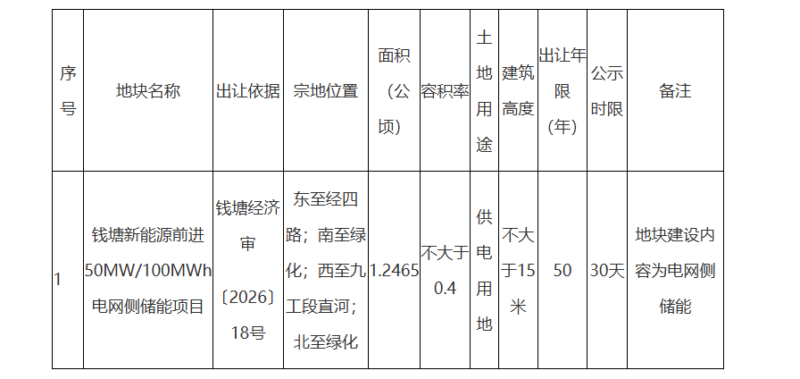 【導(dǎo)讀】2026 年 3 月 11 日杭州錢塘分局發(fā)布 50MW/100MWh 電網(wǎng)側(cè)儲能項目出讓計劃公示,項目用地面積 1.2465 公頃,容積率不大于 0.4,公示期 30 日,意向單位書面報名截止 2026 年 4 月 11 日 17 點。下文將解讀項目地塊詳情與出讓報名規(guī)則。 3月11日,浙江杭州市規(guī)劃和自然資源局錢塘分局發(fā)布錢塘新能源前進50MW/100MWh電網(wǎng)側(cè)儲能項目出讓計劃公示,該地塊名稱為錢塘新能源前進50MW/100MWh電網(wǎng)側(cè)儲能項目,地塊建設(shè)內(nèi)容為電網(wǎng)側(cè)儲能,面積為1.2465公頃,容積率不大于0.4。 公示期為30日,公示時限內(nèi)意向用地單位須以書面形式報名。 原文如下: 錢塘新能源前進50MW/100MWh電網(wǎng)側(cè)儲能項目出讓計劃公示 按國土資源部第21號令規(guī)定,以下用地項目出讓計劃方案已經(jīng)批準(zhǔn),現(xiàn)予以公布: