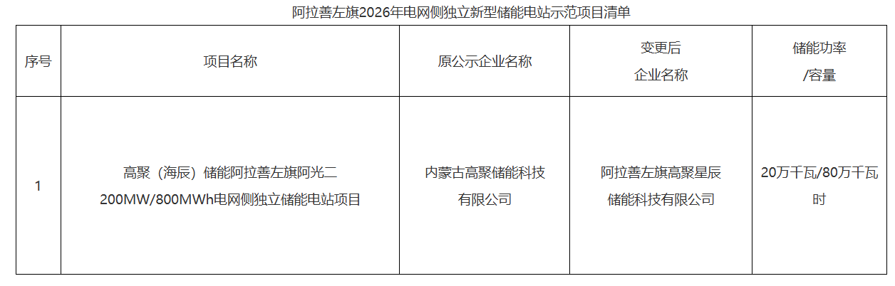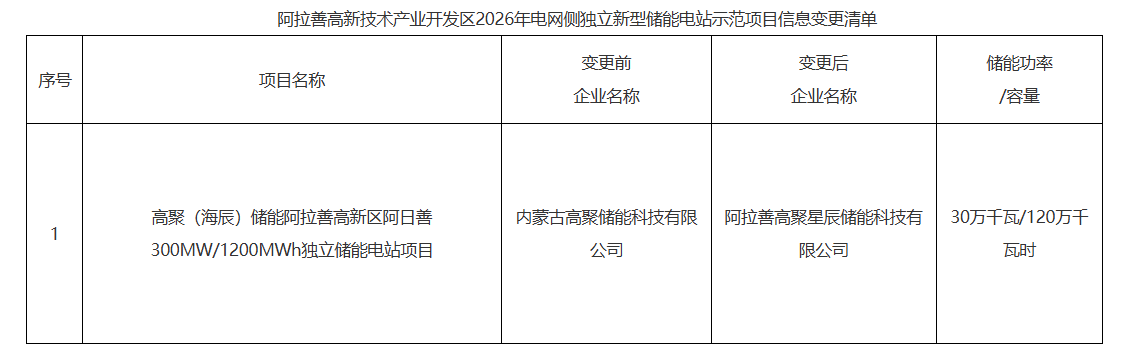 3月9日,內(nèi)蒙古阿拉善高新技術(shù)產(chǎn)業(yè)開發(fā)區(qū)發(fā)布2026年電網(wǎng)側(cè)獨(dú)立新型儲(chǔ)能電站示范項(xiàng)目開發(fā)主體的公告,項(xiàng)目名稱為高聚(海辰)儲(chǔ)能阿拉善高新區(qū)阿日善300MW/1200MWh獨(dú)立儲(chǔ)能電站項(xiàng)目,變更前企業(yè)名稱為內(nèi)蒙古高聚儲(chǔ)能科技有限公司,變更后的企業(yè)名稱為阿拉善高聚星辰儲(chǔ)能科技有限公司,后者為前者的全資子公司。 同日,內(nèi)蒙古阿拉善左旗發(fā)布2026年電網(wǎng)側(cè)獨(dú)立新型儲(chǔ)能電站示范項(xiàng)目開發(fā)主體的公告,項(xiàng)目為高聚(海辰)儲(chǔ)能阿拉善左旗阿光二200MW/800MWh電網(wǎng)側(cè)獨(dú)立儲(chǔ)能電站項(xiàng)目,變更前企業(yè)為內(nèi)蒙古高聚儲(chǔ)能科技有限公司,變更后企業(yè)為阿拉善左旗高聚星辰儲(chǔ)能科技有限公司。