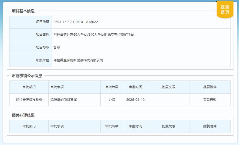 【項目追蹤】阿拉善盟御博新能源科技有限公司申報的阿拉善定遠(yuǎn)營60萬千瓦/240萬千瓦時獨立新型儲能項目完成備案。項目位于內(nèi)蒙古阿拉善左旗,總投資21.63億元,占地約245畝,規(guī)劃建設(shè)1座600MW/2.4GWh電化學(xué)獨立儲能電站,配套建設(shè)儲能單元、智能管控系統(tǒng)等設(shè)施。項目建設(shè)周期為2026年3月至2027年6月。 3月12日,阿拉善盟御博新能源科技有限公司申報的阿拉善定遠(yuǎn)營60萬千瓦/240萬千瓦時獨立新型儲能項目,正式完成能源類項目備案。