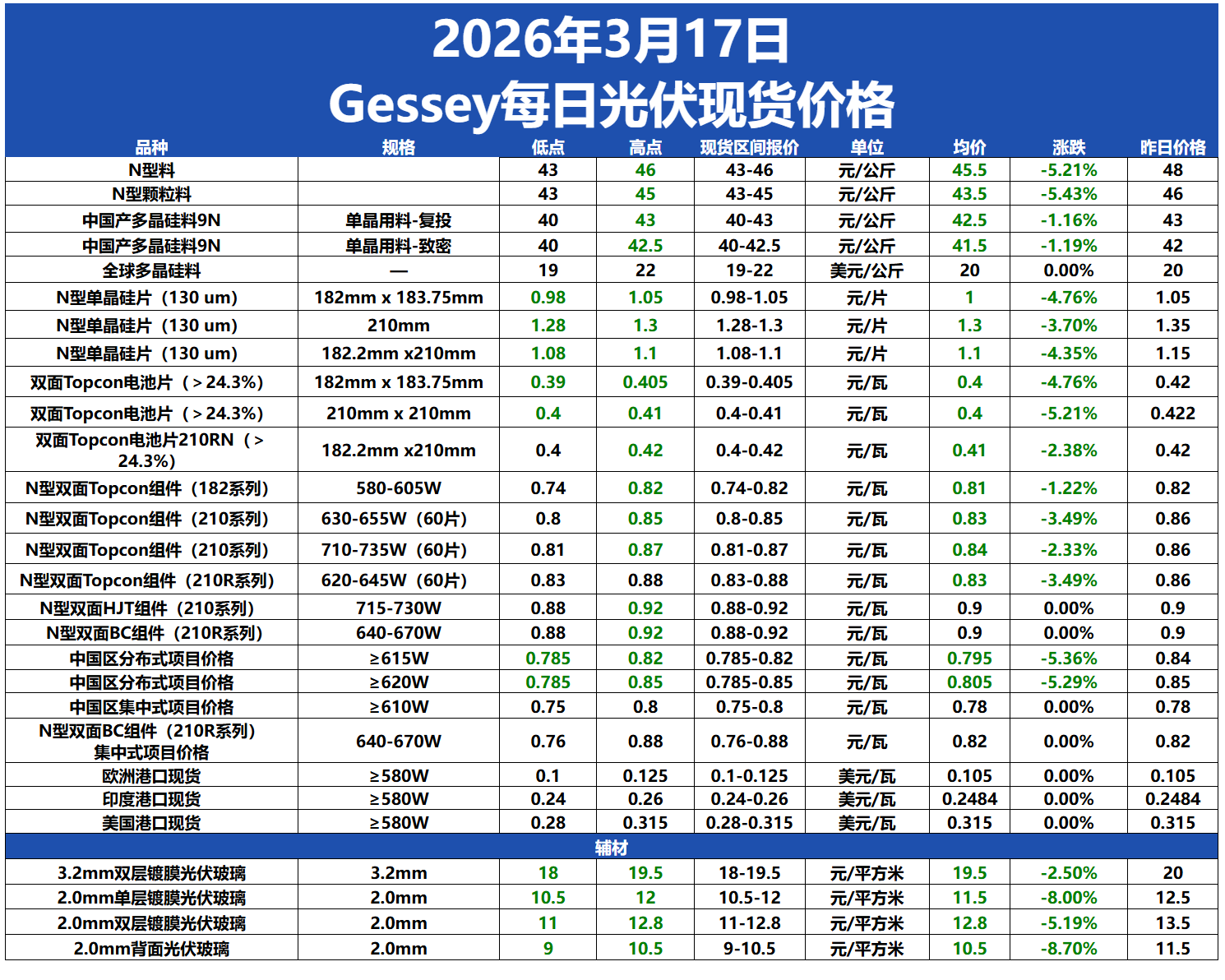 現(xiàn)貨市場價(jià)格變動(dòng): 多晶硅: 今日硅料價(jià)格小幅下跌,N型料主流價(jià)格在43-46元/公斤,均價(jià)45.5元/公斤,下降5.21%。N型顆粒硅主流價(jià)格在43-45元/公斤,均價(jià)43.5元/公斤,下降5.43%。國產(chǎn)復(fù)投特級(jí)硅料主流價(jià)格在40-43元/公斤,均價(jià)42.5元/公斤,下降1.16%。國產(chǎn)致密特級(jí)硅料主流價(jià)格在40-42.5元/公斤,均價(jià)41.5元/公斤,下降1.19%。全球多晶硅料主流價(jià)格在19-22元/公斤,均價(jià)20元/公斤。 硅片: 今日硅片價(jià)格小幅下跌,N型-183.75mm單晶硅片主流現(xiàn)貨價(jià)格維持0.98-1.05元/片,均價(jià)1元/片,下降4.76%。N型-210mm單晶硅片主流現(xiàn)貨價(jià)格維持1.28-1.3元/片,均價(jià)1.3元/片,下降3.70%。N型-210Rmm單晶硅片主流現(xiàn)貨價(jià)格1.08-1.1元/片,均價(jià)1.1元/片,下降4.35%。 電池片: 今日電池片價(jià)格小幅下跌,24.3%以上183.75mm雙面Topcon電池片主流價(jià)格在0.39-0.405元/瓦,均價(jià)0.4元/瓦,下降4.76%。24.3%以上210mm雙面Topcon電池片主流價(jià)格在0.4-0.41元/瓦,均價(jià)0.4元/瓦,下降5.21%。24.3%以上210Rmm雙面Topcon電池片主流價(jià)格在0.4-0.42元/瓦,均價(jià)0.41元/瓦,下降2.38%。 組件: 今日組件價(jià)格小幅下跌,N型雙面Topcon 組件(182系列)價(jià)格在0.74-0.82元/ 瓦,均價(jià)為0.81元/瓦,下降1.22%。N型雙面Topcon 組件(210系列)價(jià)格在0.8-0.85元/ 瓦,均價(jià)為0.83元/瓦,下降3.49%。N型雙面Topcon組件(210系列)(700-725W(60片)價(jià)格在0.81-0.87元/ 瓦,均價(jià)為0.84元/瓦,下降2.33%。N型雙面Topcon組件(210R系列)(610-635W(60片))價(jià)格在0.83-0.88元/ 瓦,均價(jià)為0.83元/瓦,下降3.49%。N型雙面HJT組件(210系列)價(jià)格在0.88-0.92元/ 瓦,均價(jià)為0.9元/瓦。N型雙面BC組件(210R系列)價(jià)格在0.88-0.92元/ 瓦,均價(jià)為0.9元/瓦。中國區(qū)分布式項(xiàng)目(≥595W)價(jià)格在0.785-0.82元/瓦,均價(jià)為0.795元/瓦,,下降5.36%。中國區(qū)分布式項(xiàng)目(≥615W)價(jià)格在0.785-0.85元/瓦,均價(jià)為0.805元/瓦,,下降5.29%。中國區(qū)集中式項(xiàng)目(≥585W)價(jià)格在0.75-0.8元/ 瓦,均價(jià)為0.78元/瓦。N型雙面BC組件(210R系列)集中式項(xiàng)目價(jià)格在0.76-0.88元/ 瓦,均價(jià)為0.82元/瓦。歐洲港口現(xiàn)貨價(jià)格在0.1-0.125美元/ 瓦,均價(jià)為0.105美元/瓦。印度港口現(xiàn)貨價(jià)格在0.24-0.26美元/ 瓦,均價(jià)為0.2484美元/瓦。美國港口現(xiàn)貨價(jià)格在0.28-0.315美元/ 瓦,均價(jià)為0.315美元/瓦。 玻璃: 今日玻璃價(jià)格小幅下跌,3.2mm雙層鍍膜光伏玻璃價(jià)格在18-19.5元/平方米,均價(jià)為19.5元/平方米,下降2.50%。2.0mm單層鍍膜光伏玻璃價(jià)格在10.5-12元/平方米,均價(jià)為11.5元/平方米,下降8.00%。2.0mm雙層鍍膜光伏玻璃價(jià)格在11-12.8元/平方米,均價(jià)為12.8元/平方米,下降5.19%。2.0mm背面光伏玻璃價(jià)格在9-10.5元/平方米,均價(jià)為10.5元/平方米,下降8.70%。 聚焦每日行情波動(dòng): 今日硅料價(jià)格小幅下跌,N型料主流價(jià)格在43-46元/公斤,均價(jià)45.5元/公斤,下降5.21%。N型顆粒硅主流價(jià)格在43-45元/公斤,均價(jià)43.5元/公斤,下降5.43%。國產(chǎn)復(fù)投特級(jí)硅料主流價(jià)格在40-43元/公斤,均價(jià)42.5元/公斤,下降1.16%。國產(chǎn)致密特級(jí)硅料主流價(jià)格在40-42.5元/公斤,均價(jià)41.5元/公斤,下降1.19%。全球多晶硅料主流價(jià)格在19-22元/公斤,均價(jià)20元/公斤。 今日硅片價(jià)格小幅下跌,N型-183.75mm單晶硅片主流現(xiàn)貨價(jià)格維持0.98-1.05元/片,均價(jià)1元/片,下降4.76%。N型-210mm單晶硅片主流現(xiàn)貨價(jià)格維持1.28-1.3元/片,均價(jià)1.3元/片,下降3.70%。N型-210Rmm單晶硅片主流現(xiàn)貨價(jià)格1.08-1.1元/片,均價(jià)1.1元/片,下降4.35%。 今日組件價(jià)格小幅下跌,N型雙面Topcon 組件(182系列)價(jià)格在0.74-0.82元/ 瓦,均價(jià)為0.81元/瓦,下降1.22%。N型雙面Topcon 組件(210系列)價(jià)格在0.8-0.85元/ 瓦,均價(jià)為0.83元/瓦,下降3.49%。N型雙面Topcon組件(210系列)(700-725W(60片)價(jià)格在0.81-0.87元/ 瓦,均價(jià)為0.84元/瓦,下降2.33%。N型雙面Topcon組件(210R系列)(610-635W(60片))價(jià)格在0.83-0.88元/ 瓦,均價(jià)為0.83元/瓦,下降3.49%。中國區(qū)分布式項(xiàng)目(≥595W)價(jià)格在0.785-0.82元/瓦,均價(jià)為0.795元/瓦,,下降5.36%。中國區(qū)分布式項(xiàng)目(≥615W)價(jià)格在0.785-0.85元/瓦,均價(jià)為0.805元/瓦,,下降5.29%。 今日玻璃價(jià)格小幅下跌,3.2mm雙層鍍膜光伏玻璃價(jià)格在18-19.5元/平方米,均價(jià)為19.5元/平方米,下降2.50%。2.0mm單層鍍膜光伏玻璃價(jià)格在10.5-12元/平方米,均價(jià)為11.5元/平方米,下降8.00%。2.0mm雙層鍍膜光伏玻璃價(jià)格在11-12.8元/平方米,均價(jià)為12.8元/平方米,下降5.19%。2.0mm背面光伏玻璃價(jià)格在9-10.5元/平方米,均價(jià)為10.5元/平方米,下降8.70%。 硅片方面,市場庫存壓力持續(xù)增大,由于下游電池片企業(yè)需求訂單集中度高,外銷型采購硅片量并未有效提升,目前主流均價(jià)維持N183.78-1元/片,N210-1.3元/片,N210R-1.1元/片,由于需求疲軟,硅片企業(yè)為緩解庫存壓力,不得不降低價(jià)格以促進(jìn)銷售,價(jià)格的持續(xù)下滑態(tài)勢短期內(nèi)恐難改變。另外不排除部分硅片企業(yè)后續(xù)有減產(chǎn)計(jì)劃。 電池片環(huán)節(jié),受上游硅料和硅片價(jià)