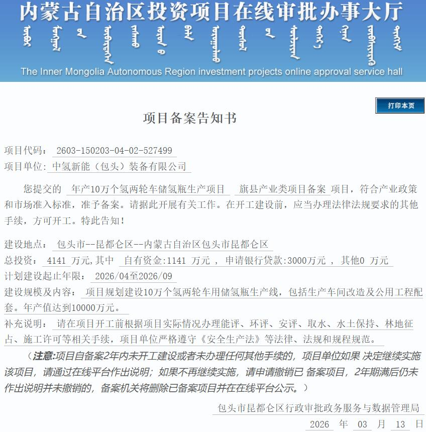 年產(chǎn)值達(dá)1億元!10萬個(gè)氫兩輪車儲(chǔ)氫瓶生產(chǎn)項(xiàng)目獲備案2026-03-17 10:40瀏覽數(shù):186次