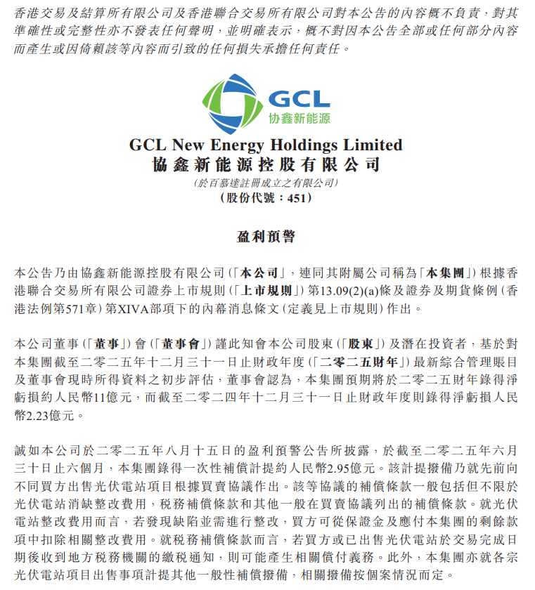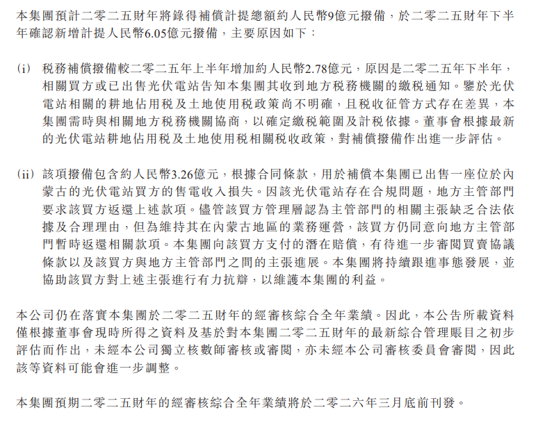 【核心數(shù)據(jù)提煉】3月15日,協(xié)鑫新能源發(fā)布盈利預(yù)警,預(yù)計(jì)2025財(cái)年凈虧損約 11 億元,較2024財(cái)年2.23億元虧損顯著擴(kuò)大。虧損主因補(bǔ)償計(jì)提大幅增加,全年計(jì)提總額約9億元,下半年新增6.05億元,其中稅務(wù)補(bǔ)償撥備增2.78億元,另計(jì)提3.26億元補(bǔ)償已售光伏電站售電損失。 3月15日,協(xié)鑫新能源發(fā)布盈利預(yù)警公告稱(chēng),集團(tuán)預(yù)計(jì)將在2025財(cái)年錄得凈虧損約11億元,而截至2024年12月31日止財(cái)年則錄得凈虧損2.23億元。本公司董事會(huì)基于對(duì)最新綜合管理賬目的初步評(píng)估,指出此次虧損主要是由于補(bǔ)償計(jì)提的增加。 公告中提到,本集團(tuán)預(yù)計(jì)將在2025財(cái)年錄得補(bǔ)償計(jì)提總額約9億元,預(yù)計(jì)在下半年確認(rèn)新增計(jì)提6.05億元。具體原因包括稅務(wù)補(bǔ)償撥備增加約2.78億元,因相關(guān)買(mǎi)方收到地方稅務(wù)機(jī)關(guān)的繳稅通知。此外,補(bǔ)償撥備中包含約3.26億元,用于補(bǔ)償已出售光伏電站買(mǎi)方的售電收入損失。該光伏電站因合規(guī)問(wèn)題,地方主管部門(mén)要求買(mǎi)方返還款項(xiàng)。