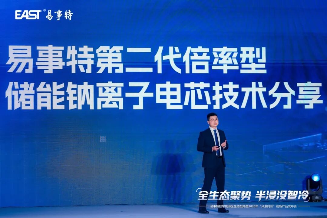 第三代半浸沒(méi)式儲(chǔ)能系統(tǒng) 6.7MWh大容量,能量密度更高,減少占地面積;簇級(jí)溫差≤2℃,極致均溫延長(zhǎng)電池壽命;噪音<70dB,友好適配工業(yè)園區(qū);全生命周期度電成本降低10%。 這一行業(yè)首創(chuàng)技術(shù)的發(fā)布,標(biāo)志著易事特在液冷技術(shù)領(lǐng)域邁出了關(guān)鍵一步,也為充儲(chǔ)行業(yè)樹(shù)立了新的技術(shù)標(biāo)桿。 技術(shù)矩陣 鈉電突破 · 算力底座 · 智慧賦能 技術(shù)進(jìn)化:鈉電倍率再攀高峰 易事特集團(tuán)副總裁、鈉電公司總工程師陳統(tǒng)銘博士帶來(lái)第二代倍率型儲(chǔ)能鈉離子電芯最新成果分享。新一代鈉電在倍率性能和低溫表現(xiàn)上實(shí)現(xiàn)雙重突破,為多元化場(chǎng)景應(yīng)用提供了更優(yōu)解。