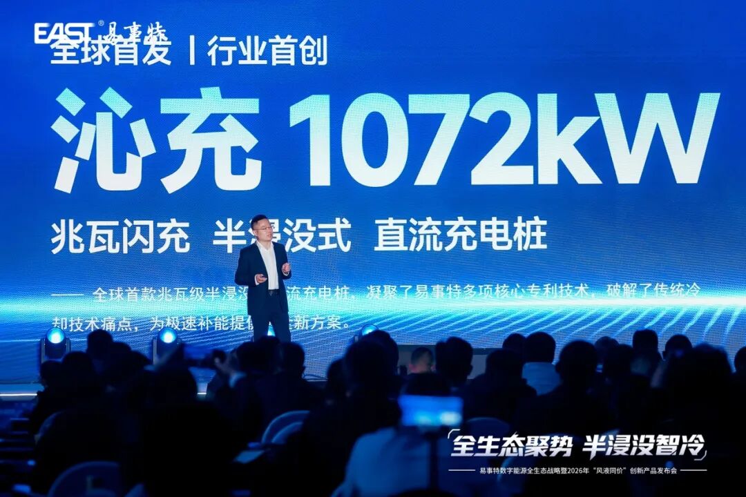 重磅首發(fā) 易事特儲(chǔ)能科技有限公司總工程師馬超群隆重發(fā)布行業(yè)首創(chuàng)的半浸沒(méi)式液冷技術(shù),并推出沁充1072kW兆瓦閃充與第三代半浸沒(méi)式儲(chǔ)能系統(tǒng)兩款新品。一項(xiàng)技術(shù)雙重賦能,實(shí)現(xiàn)散熱效率、安全性與能量密度的三重躍升。 沁充1072kW兆瓦閃充 以更高效的溫控能力支撐大功率充電場(chǎng)景,帶來(lái)“充電像加油一樣快”的極致體驗(yàn)。壽命超10年,模塊失效率<0.1%,運(yùn)維成本大幅降低;噪音≤45dB,IP65/C5高防護(hù),免維護(hù)智能除塵實(shí)現(xiàn)無(wú)人值守;以風(fēng)冷成本享液冷體驗(yàn),風(fēng)液同價(jià),重新定義充電設(shè)施性?xún)r(jià)比。