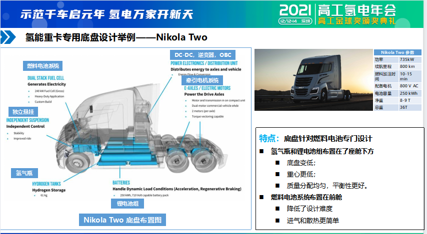 三一重工宛朝輝:氫能重卡,利刃出鞘“三一集團正全面布局氫能業(yè)務,為客戶打造‘制-儲-運-加-應用’為一體的氫能及燃料電池整體解決方案。”三一重工氫燃料產品規(guī)劃院院長宛朝輝透露,三一氫能科技有限公司是三一集團將成立的、主要負責氫能裝備及燃料電池全產業(yè)鏈板塊的公司。 12月12-14日,2021高工氫電年會暨高工金球獎頒獎典禮在深圳機場凱悅酒店盛大舉辦。在12月12日上午舉辦的開幕式專場,宛朝輝博士發(fā)表了“氫能重卡,利刃出鞘”的主題演講。 現(xiàn)階段,國內氫能重卡、燃油重卡和純電重卡三足鼎立,從長遠來看,燃油重卡勢必被氫能重卡和純電動重卡替代。其中,氫能重卡由于相較于純電動重卡具有環(huán)保、續(xù)航里程長、補能時間短、抗低溫性能好等優(yōu)勢,未來有望成為“產品之星”。 對于未來氫能重卡的發(fā)展方向,宛朝輝特別提到“大功率低成本”、“輕量化”、“經濟性”。 他認為,氫能重卡會持續(xù)向大功率發(fā)展,在這一過程中,企業(yè)一定要注意系統(tǒng)散熱的問題;要實現(xiàn)低成本,可通過規(guī)?;?、國產化、工藝進步等路徑進行。 與此同時,企業(yè)要重視開發(fā)氫能重卡專用底盤,實現(xiàn)圓線電機向扁線電機、集中式向分布式、傳統(tǒng)底盤向線控底盤的變革;分布式可縮短產品開發(fā)周期,降低生產成本,更具經濟性;線控底盤是自動駕駛與新能源汽車中間的一個結合點,是實現(xiàn)高級智能駕駛的關鍵載體。 在提升氫能重卡的輕量化方面,目前國內車載儲氫系統(tǒng)主要采用基于金屬內膽III型瓶的高壓氣態(tài)儲氫,國外多采用70MPa塑料內膽Ⅳ型瓶,儲氫密度最大,可長時間儲存,重量輕,適合乘用車和中短途商用車。實現(xiàn)氫能重卡的輕量化,企業(yè)也可以從推廣與搭載70MPa塑料內膽Ⅳ型瓶入手。 對于氫能重卡的經濟性問題,宛朝輝判斷,隨著氫能重卡技術水平的提升,其氫耗會不斷降低;車輛的規(guī)模化和國產化,將推動車輛TCO成本的持續(xù)下降。這些將最終使氫能重卡的經濟性超過燃油車。此外,未來通過光電、風電制氫等可再生能源制氫,以此降低氫氣成本,亦可提高氫能重卡的經濟性。 為了推進氫能重卡的商業(yè)應用,他還特別建議,可以優(yōu)先在高速公路布局加氫站網(wǎng)絡,以推動中長途、中重載場景運輸需求。