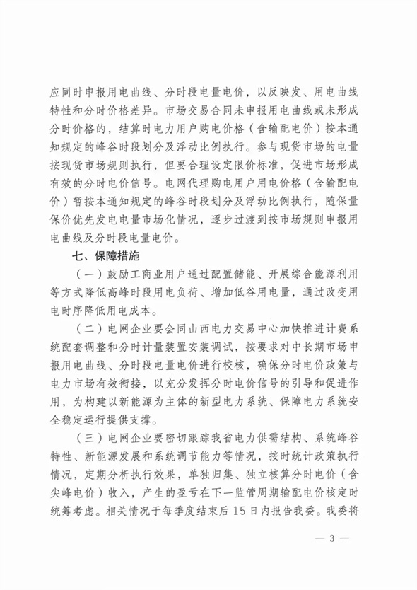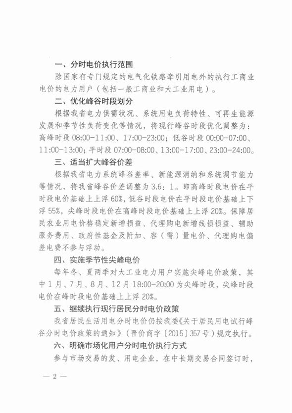山西省發(fā)改委發(fā)布關(guān)于完善分時電價機(jī)制有關(guān)事項(xiàng)的通知,通知中提出鼓勵工商業(yè)用戶通過配置儲能、開展綜合能源利用等方式降低高峰時段用電負(fù)荷、增加低谷用電量,通過改變用電時序降低用電成本。 將峰谷價差調(diào)整為3.6:1。即高峰時段電價在平時段電價基礎(chǔ)上上浮 60%,低谷時段電價在平時段電價基礎(chǔ)上下浮55%,尖峰時段電價在高峰時段電價基礎(chǔ)上上浮 20%。保障居民農(nóng)業(yè)用電價格穩(wěn)定新增損益、代理購電新增線損損益、輔助服務(wù)費(fèi)用、政府性基金及附加、容(需)量電價、代理購電偏差電費(fèi)不參與浮動。