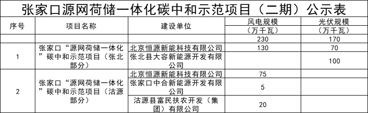 12月21日,河北省發(fā)改委發(fā)布《張家口源網(wǎng)荷儲一體化碳中和示范項目(二期)公示》。公示中提出項目建設(shè)規(guī)模4GW,其中光伏1.7GW、風(fēng)電2.3GW。 原文如下: 張家口源網(wǎng)荷儲一體化碳中和示范項目(二期)公示 為支持張家口可再生能源示范區(qū)建設(shè),深入探索可再生能源與大數(shù)據(jù)產(chǎn)業(yè)聯(lián)動發(fā)展新路徑,推動數(shù)據(jù)中心充分利用風(fēng)能、太陽能等可再生能源?,F(xiàn)對張家口源網(wǎng)荷儲一體化碳中和示范項目(二期)予以公示,項目建設(shè)規(guī)模400萬千瓦,其中光伏170萬千瓦、風(fēng)電230萬千瓦,具體名單見附件。 公示時間為2021年12月21日至12月23日。期間如有異議,請向省發(fā)展改革委(能源局)新能源處反映。 聯(lián)系電話:0311—88600512(傳真) 電子郵箱:nyjxnyc@hbdrc.gov.cn 附件:張家口源網(wǎng)荷儲一體化碳中和示范項目(二期)公示表 河北省發(fā)展和改革委員會 2021年12月21日