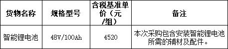 中國鐵塔股份有限公司重慶市分公司發(fā)布2022年智能鋰電池招標公告,公告中提出項目總金額2000萬元,鋰電池4520元/組,電池單價0.94元/Wh。 原文如下: 中國鐵塔重慶市分公司2022年智能鋰電池采購項目招標公告本招標項目為中國鐵塔重慶市分公司2022年智能鋰電池采購項目(集中招標項目名稱、招標編號:dxzb-2021-A0311),招標人為中國鐵塔股份有限公司重慶市分公司,招標代理機構(gòu)為鼎信項目管理咨詢有限公司。項目資金由招標人自籌,項目出資比例為100%,資金已落實。項目已具備招標條件,現(xiàn)進行公開招標,有意向的投標人(以下簡稱投標人)可前來投標。 1.招標范圍 1.1 招標內(nèi)容:本項目為集中招標項目。 1.1.1預(yù)估規(guī)模:含稅金額2000萬元。