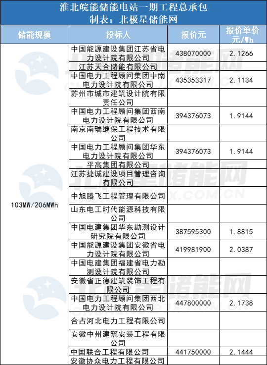 淮北皖能儲能電站一期103MW/206MWh工程總承包開標(biāo)。 平高集團(tuán)有限公司、山東電工時代、南瑞繼保、江蘇捷誠建設(shè)項目管理咨詢有限公司、中旭騰飛工程管理有限公司、中國電建集團(tuán)華東勘測設(shè)計研究院有限公司、中國能源建設(shè)集團(tuán)安徽省電力設(shè)計院有限公司、中國電力工程顧問集團(tuán)、安徽省正德建筑裝飾工程有限公司、中國聯(lián)合工程有限公司、安徽協(xié)眾電力工程有限公司等20家企業(yè)參與投標(biāo)。 其中最高報價為中國電力工程顧問集團(tuán)西北電力設(shè)計院有限公司的44780萬,儲能單價2.17元/Wh,最低報價為中國電建集團(tuán)華東勘測設(shè)計研究院有限公司的38759.53萬,儲能單價1.88元/Wh。