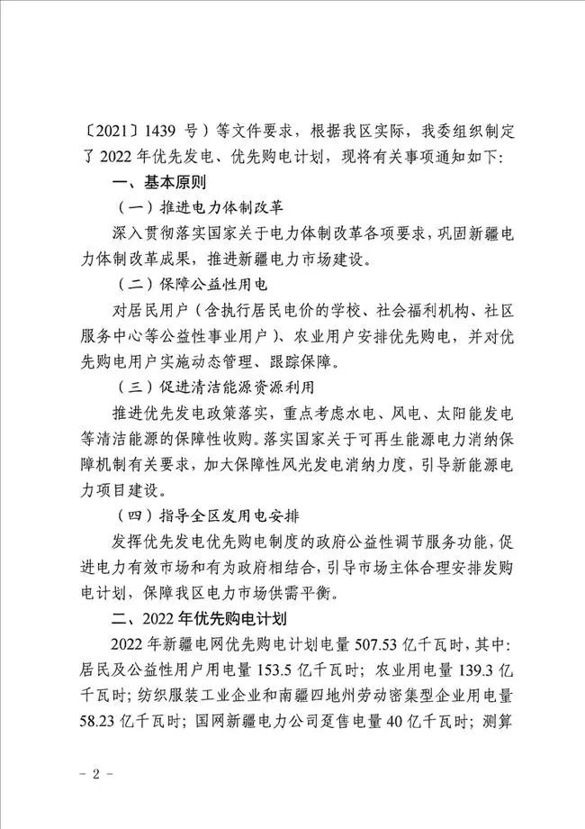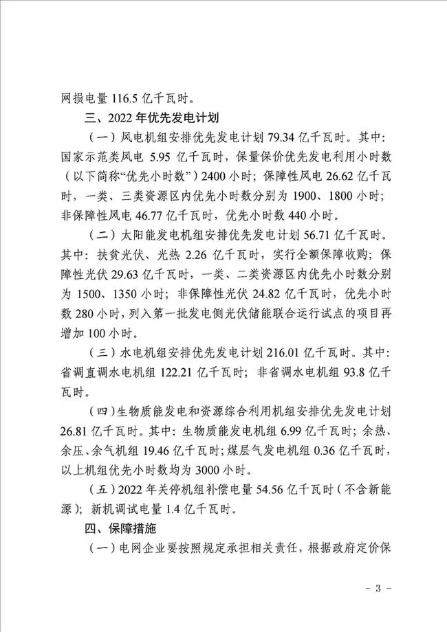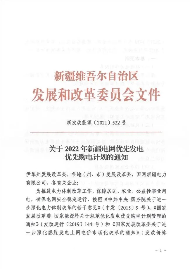 新疆維吾爾自治區(qū)發(fā)改委發(fā)布《關(guān)于2022年新疆電網(wǎng)優(yōu)先發(fā)電優(yōu)先購(gòu)電計(jì)劃的通知》?!锻ㄖ分赋?,推進(jìn)優(yōu)先發(fā)電政策落實(shí),重點(diǎn)考慮水電、風(fēng)電、太陽(yáng)能發(fā)電等清潔能源的保障性收購(gòu)。落實(shí)國(guó)家關(guān)于可再生能源電力消納保障機(jī)制有關(guān)要求,加大保障性風(fēng)光發(fā)電消納力度,引導(dǎo)新能源電力項(xiàng)目建設(shè)。 2022年新疆電網(wǎng)優(yōu)先購(gòu)電計(jì)劃電量507.53億千瓦時(shí)。太陽(yáng)能發(fā)電機(jī)組安排優(yōu)先發(fā)電計(jì)劃56.71億千瓦時(shí)。其中:扶貧光伏、光熱2.26億千瓦時(shí),實(shí)行全額保障收購(gòu);保障性光伏29.63億千瓦時(shí),一類、二類資源區(qū)內(nèi)優(yōu)先小時(shí)數(shù)分別為1500、1350小時(shí);非保障性光伏24.82億千瓦時(shí),優(yōu)先小時(shí)數(shù)280小時(shí),列入第一批發(fā)電側(cè)光伏儲(chǔ)能聯(lián)合運(yùn)行試點(diǎn)的項(xiàng)目再增加100小時(shí)。