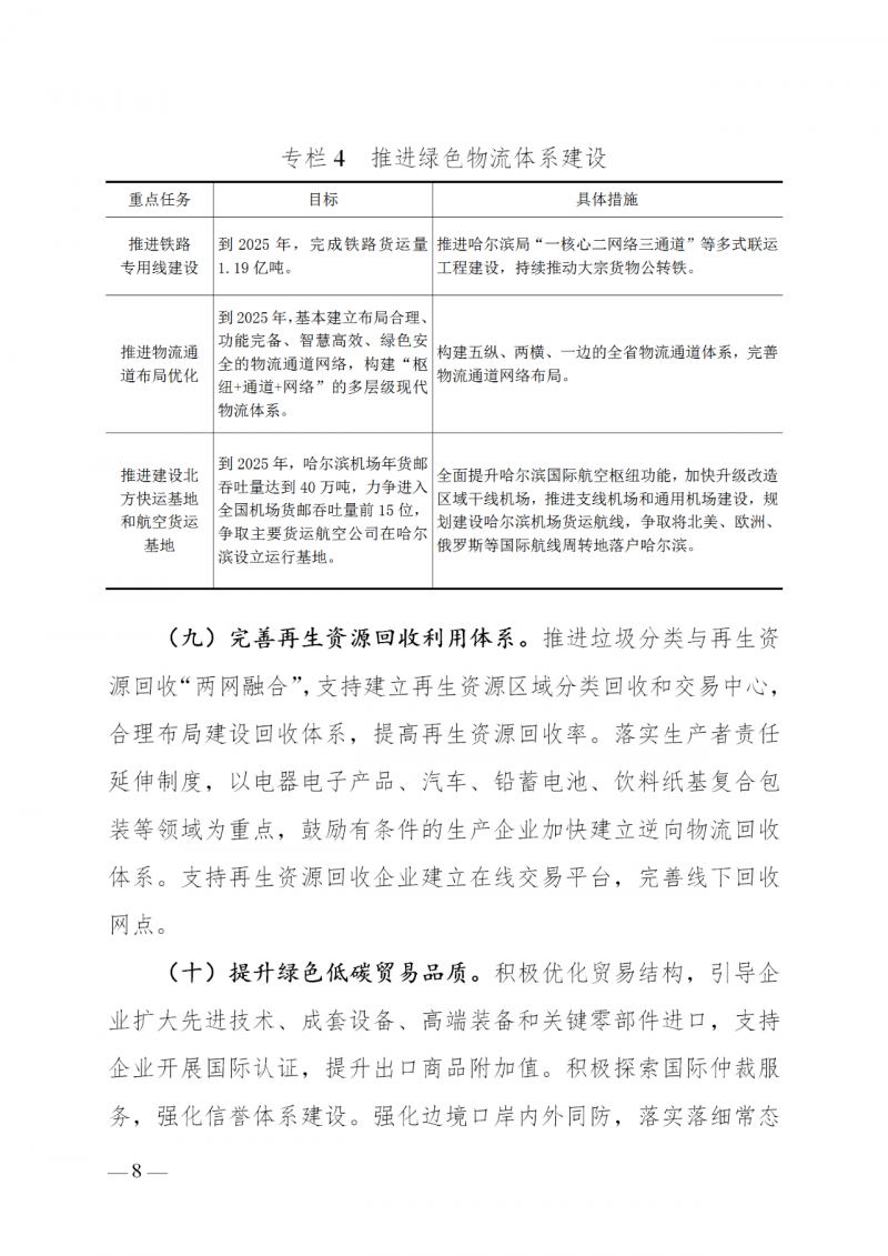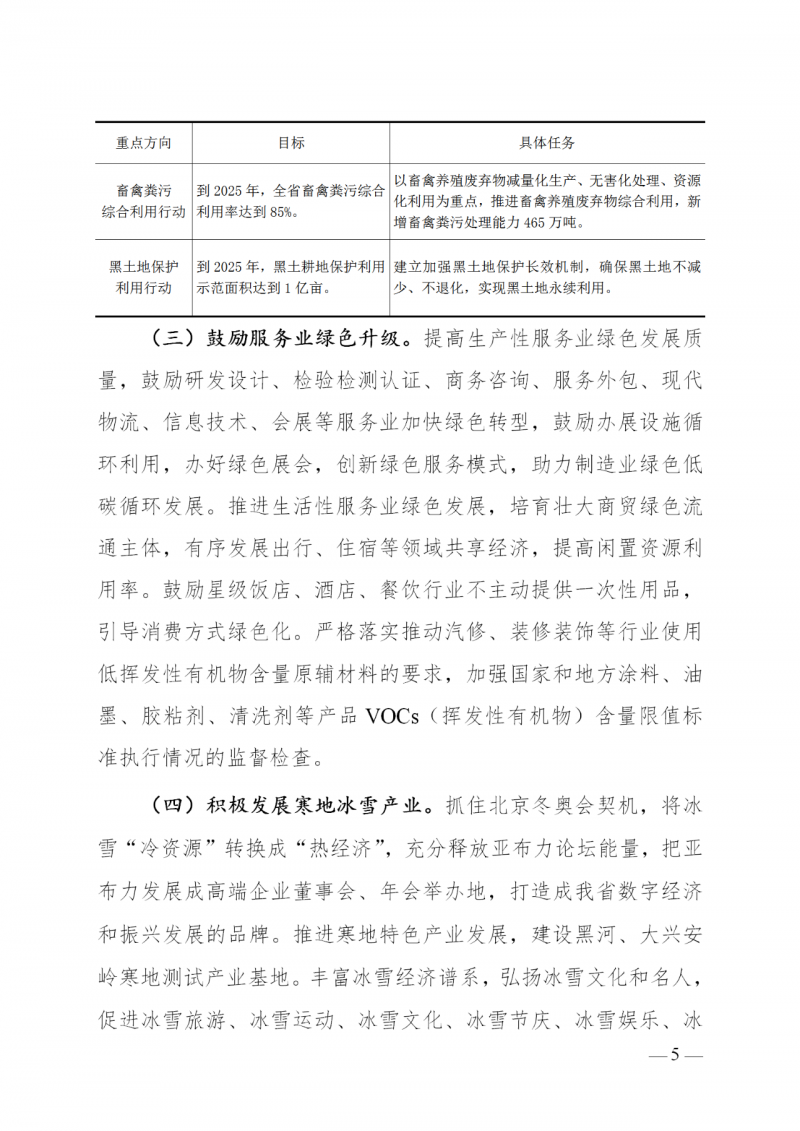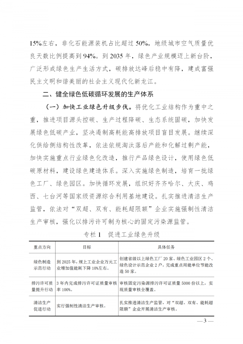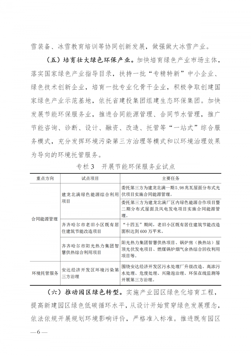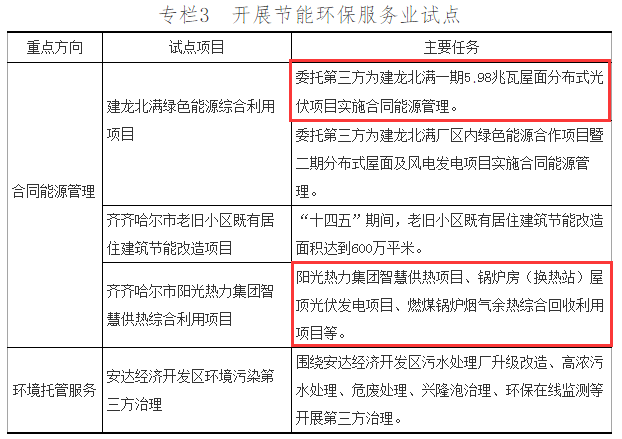 《通知》指出,到2025年,綠色產(chǎn)業(yè)比重明顯提升,綠色低碳循環(huán)發(fā)展的生產(chǎn)體系、流通體系、消費體系初步形成。單位GDP能耗下降15%,單位GDP二氧化碳排放下降16%,非化石能源消費比重提高到15%左右,非化石能源裝機占比超過50%,地級城市空氣質(zhì)量優(yōu)良天數(shù)比例提高到94%。到2035年,綠色產(chǎn)業(yè)規(guī)模邁上新臺階,廣泛形成綠色生產(chǎn)生活方式,碳排放達峰后穩(wěn)中有降,建成富強民主文明和諧美麗的社會主義現(xiàn)代化新龍江。 同時,開展節(jié)能環(huán)保服務業(yè)試點。與光伏相關的試點項目有建龍北滿綠色能源綜合利用項目、齊齊哈爾市陽光熱力集團智慧供熱綜合利用項目。