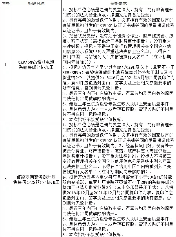 1月7日,上海發(fā)電設(shè)備成套設(shè)計研究院有限責(zé)任公司發(fā)布基于儲能和系統(tǒng)自蓄能的機組運行技術(shù)研究項目招標,招標分兩標段,6MW/6MWh儲能電池系統(tǒng)集成外協(xié)加工與儲能雙向變流器升壓集裝箱(PCS箱)外協(xié)加工。 6MW/6MWh儲能電池系統(tǒng)集成外協(xié)加工要求投標人近五年內(nèi)至少具有6MW/6MWh及以上(單套不小于3MW/3MWh)磷酸鐵鋰儲能電池系統(tǒng)集成外協(xié)加工制造及供貨業(yè)績2個。原文如下: 基于儲能和系統(tǒng)自蓄能的機組運行技術(shù)研究項目招標公告 1.招標條件 招標人:上海發(fā)電設(shè)備成套設(shè)計研究院有限責(zé)任公司 招標代理機構(gòu):中國電能成套設(shè)備有限公司 項目業(yè)主:上海發(fā)電設(shè)備成套設(shè)計研究院有限責(zé)任公司 項目資金來源:自有資金 項目已具備招標條件,現(xiàn)進行公開招標。 2.項目概況與招標范圍 2.1項目概況 項目名稱:基于儲能和系統(tǒng)自蓄能的機組運行技術(shù)研究項目。 招標范圍: 標段一:6MW/6MWh儲能電池系統(tǒng)集成外協(xié)加工,具體見招標文件技術(shù)附件部分。 標段二:儲能雙向變流器升壓集裝箱(PCS箱)外協(xié)加工,具體見招標文件技術(shù)附件部分。 建設(shè)地點:重慶市合川區(qū)雙槐鎮(zhèn)國家電投集團重慶合川發(fā)電有限公司。 投標范圍:必須包括招標文件中要求的全部供貨范圍。 進度要求:收到中標通知書后50天(日歷日)內(nèi)交貨至項目現(xiàn)場,且不晚于2022年4月6日。 2.2招標范圍 注:招標范圍以招標文件為準。 3.投標人資格要求