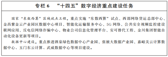 (六)全面推進數(shù)字化轉(zhuǎn)型。 推動數(shù)字產(chǎn)業(yè)化。搶抓數(shù)字經(jīng)濟發(fā)展機遇,積極服務(wù)“東數(shù)西算”,爭取與上海、深圳等地區(qū)合作,努力打造絲綢之路經(jīng)濟帶區(qū)域信息匯集中心和大數(shù)據(jù)產(chǎn)業(yè)高地。按照全國一體化大數(shù)據(jù)中心協(xié)同創(chuàng)新體系要求,將張掖、金昌、酒泉等打造成支點性數(shù)據(jù)中心。 加快產(chǎn)業(yè)數(shù)字化轉(zhuǎn)型。加大大數(shù)據(jù)、人工智能、區(qū)塊鏈在工業(yè)、農(nóng)業(yè)、旅游業(yè)、商貿(mào)物流企業(yè)中的應(yīng)用力度。促進鋼鐵、能源、新材料等具有比較優(yōu)勢行業(yè)與5G、云計算、人工智能、區(qū)塊鏈等新技術(shù)深度融合,加快數(shù)字化車間和智能工廠建設(shè)。加快工業(yè)數(shù)字化、智能化改造,提高制造業(yè)數(shù)字化控制和管理水平,鼓勵企業(yè)加強生產(chǎn)和產(chǎn)品的聯(lián)網(wǎng)監(jiān)控,提高資源利用效率,提升企業(yè)生產(chǎn)效率和售后服務(wù)水平。加快發(fā)展數(shù)字農(nóng)業(yè),實現(xiàn)農(nóng)業(yè)生產(chǎn)管理精準(zhǔn)化,建立農(nóng)產(chǎn)品大數(shù)據(jù)分析中心、農(nóng)產(chǎn)品大數(shù)據(jù)交易平臺。發(fā)展服務(wù)型數(shù)字經(jīng)濟、推進文旅數(shù)據(jù)資源共享,構(gòu)建智慧旅游公共服務(wù)體系。依法依規(guī)支持企業(yè)利用互聯(lián)網(wǎng)平臺深化電子商務(wù)應(yīng)用,開展跨境電子商務(wù),提升供應(yīng)鏈協(xié)同效率。 提升公共服務(wù)數(shù)字化水平。深化大數(shù)據(jù)融合應(yīng)用,加快公共數(shù)據(jù)開放共享,提升全民數(shù)字技能,實現(xiàn)信息服務(wù)全覆蓋。建設(shè)城鄉(xiāng)數(shù)字化管理平臺和感知系統(tǒng),培育智慧交通、智慧物流、智慧教育、智慧醫(yī)院、智慧景區(qū)等發(fā)展新亮點,推進數(shù)字社會、數(shù)字企業(yè)、數(shù)字政府、數(shù)字社區(qū)、數(shù)字校園等建設(shè),提升全社會數(shù)字化智能化水平和數(shù)字經(jīng)濟發(fā)展支撐能力。