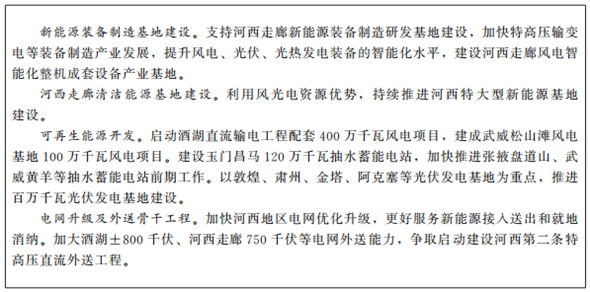1月12日,甘肅省人民政府發(fā)布“十四五”河西走廊經(jīng)濟帶發(fā)展規(guī)劃。規(guī)劃中提出加快新能源推廣應(yīng)用,開展分布式微電網(wǎng)儲和大電網(wǎng)儲等發(fā)儲用一體化商業(yè)應(yīng)用試點示范,提高新能源消納比例和調(diào)峰能力。利用關(guān)鍵電池原材料優(yōu)勢,做大做強儲能電池及電池材料產(chǎn)業(yè)。依托武威釷基熔鹽堆研究設(shè)施,探索建設(shè)風(fēng)光氫儲一體綜合能源基地。推動實施核裝備制造及核技術(shù)應(yīng)用示范基地項目、玉門新能源制氫、張掖綠色氫能陽光甲醇等項目。 做強新能源產(chǎn)業(yè)。鼓勵綠色低碳和大容量儲能技術(shù)研發(fā),提升電網(wǎng)匯集和外送能力,重點做強風(fēng)電產(chǎn)業(yè)、太陽能產(chǎn)業(yè)和智能電網(wǎng)及儲能產(chǎn)業(yè)。以酒泉千萬千瓦級風(fēng)電基地建設(shè)為依托,推動風(fēng)電機組及關(guān)鍵零部件制造,打造集研發(fā)設(shè)計、智能制造、運營服務(wù)等于一體的風(fēng)電全產(chǎn)業(yè)鏈。發(fā)揮骨干企業(yè)引領(lǐng)作用,大力研發(fā)推廣高端、高質(zhì)、高效太陽能技術(shù)產(chǎn)品和設(shè)備,做強太陽能產(chǎn)業(yè)。加快大容量輸電、大規(guī)模新能源并網(wǎng)、大規(guī)模儲能等關(guān)鍵技術(shù)推廣應(yīng)用,提升輸變電裝備配套能力和儲能關(guān)鍵技術(shù)產(chǎn)業(yè)化能力,做強智能電網(wǎng)及儲能產(chǎn)業(yè)。 原文如下: 甘肅省人民政府辦公廳印發(fā)“十四五”河西走廊經(jīng)濟帶發(fā)展規(guī)劃 依據(jù)《中華人民共和國國民經(jīng)濟和社會發(fā)展第十四個五年規(guī)劃和2035年遠(yuǎn)景目標(biāo)綱要》《中共中央國務(wù)院關(guān)于建立更加有效的區(qū)域協(xié)調(diào)發(fā)展新機制的意見》《甘肅省國民經(jīng)濟和社會發(fā)展第十四個五年規(guī)劃和2035年遠(yuǎn)景目標(biāo)綱要》和《中共甘肅省委甘肅省人民政府關(guān)于完善區(qū)域發(fā)展布局培育新的經(jīng)濟增長點增長極增長帶的意見》等,編制本規(guī)劃。規(guī)劃期為2021—2025年,展望至2035年。本規(guī)劃范圍包括酒泉市、嘉峪關(guān)市、張掖市、金昌市、武威市5個市,總面積24.78萬平方公里,2020年末總?cè)丝?40.24萬人,地區(qū)生產(chǎn)總值2291.4億元,分別占全省的58.19%、17.59%、25.41%。