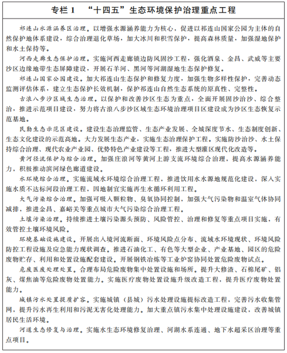 (一)協(xié)同推進祁連山生態(tài)保護和治理。 提升祁連山生態(tài)系統(tǒng)功能。堅持系統(tǒng)思維,全面保護祁連山地區(qū)森林、草原、河湖、濕地、冰川、荒漠等生態(tài)系統(tǒng)。推動自然保護地整合優(yōu)化和勘界立標(biāo)工作,加快建立健全以祁連山國家公園為主體的自然保護地體系。完善動態(tài)監(jiān)測評估體系,強化原生地帶性植被、特有珍稀物種及其棲息地保護,促進區(qū)域野生動植物種群恢復(fù)和生物多樣性保護,提升祁連山生態(tài)系統(tǒng)結(jié)構(gòu)完整性和功能穩(wěn)定性。 增強祁連山水源涵養(yǎng)功能。加強祁連山沿山淺山區(qū)生態(tài)保護,提升森林生態(tài)系統(tǒng)功能。強化冰川保護,提升祁連山生態(tài)系統(tǒng)冰川與水源涵養(yǎng)水平。開展祁連山地區(qū)山水林田湖草沙冰綜合治理,加快林草植被恢復(fù),提高森林覆蓋率和草原植被蓋度,減少水土流失。實施祁連山人工增雨雪工程,增加降水量,增加水源補給。 保障黃河上游徑流安全穩(wěn)定。以莊浪河、大通河等流域治理為重點,謀劃實施一批水源涵養(yǎng)、水土保持、水環(huán)境綜合治理提升、生態(tài)修復(fù)工程,完善黃河上游水源涵養(yǎng)和生態(tài)保護體系。積極推進河道綜合治理,強化綜合性防洪減災(zāi)體系建設(shè),著力提升防洪能力和災(zāi)害應(yīng)對能力。 加強重點生態(tài)區(qū)修復(fù)治理。對祁連山自然保護區(qū)采取自然休養(yǎng)、減畜禁牧等措施,引導(dǎo)超載人口有序轉(zhuǎn)移,減輕自然生態(tài)系統(tǒng)承載壓力,提升生態(tài)自我修復(fù)能力。強化祁連山礦山生態(tài)修復(fù)治理,嚴(yán)控水電開發(fā),加強對現(xiàn)有水電設(shè)施下泄生態(tài)流量監(jiān)管,依法依規(guī)推進旅游開發(fā)。劃定草原生態(tài)保護紅線,完善草原圍欄建設(shè)。落實屬地管理責(zé)任和部門監(jiān)管責(zé)任,堅持以水定畜、以草定畜,嚴(yán)控天然草原載畜量,統(tǒng)籌推進山丹馬場生態(tài)系統(tǒng)保護修復(fù)和可持續(xù)發(fā)展。 共建祁連山生態(tài)治理長效機制。鞏固祁連山生態(tài)環(huán)境整治成果,夯實生態(tài)基礎(chǔ)設(shè)施建設(shè),加強數(shù)據(jù)共享和環(huán)境風(fēng)險管控,完善區(qū)域一體化生態(tài)環(huán)境監(jiān)測體系。加快完善祁連山生態(tài)補償機制,健全縱向生態(tài)補償制度,探索形成以黑河等流域補償和水資源補償為主的橫向生態(tài)補償制度,全面推進肅南縣、天??h等生態(tài)綜合補償試點工作。積極擴大草原、林地補償面積。嚴(yán)格執(zhí)行自然資源資產(chǎn)離任審計、生態(tài)環(huán)境損害賠償和責(zé)任終身追究制度。強化河(湖)長制、林長制制度落實,落實環(huán)境保護主體責(zé)任,健全完善生態(tài)環(huán)境保護監(jiān)管長效機制。 (二)統(tǒng)籌推進內(nèi)陸河生態(tài)綜合治理。 建設(shè)內(nèi)陸河流域生態(tài)帶。協(xié)同推進內(nèi)陸河綜合治理和系統(tǒng)治理,以維護濕地生態(tài)系統(tǒng)健康和保護生物多樣性為核心,實施水環(huán)境保護和水生態(tài)恢復(fù)工程,加強森林草原水源涵養(yǎng)區(qū)、重點水源地和農(nóng)田草原工礦生態(tài)綜合治理,實施以林草植被建設(shè)為主的小流域綜合治理,強化管控和監(jiān)測,全面提升內(nèi)陸河生態(tài)功能。 統(tǒng)籌內(nèi)陸河流域水環(huán)境治理。實施黑河、石羊河、疏勒河、黨河等內(nèi)陸河干支流河道綜合治理工程。著力改善水質(zhì),保障水安全,完善水資源剛性約束機制,推進節(jié)水型社會高質(zhì)量發(fā)展。積極協(xié)調(diào)開展引大濟西、引大入秦延伸增效等外流域調(diào)水前期工作,以緩解金昌、武威資源性缺水現(xiàn)狀,解決石羊河流域生態(tài)補水問題。積極開展河西生態(tài)補水工程研究論證工作。 (三)共建防風(fēng)防沙治沙生態(tài)帶。 構(gòu)建荒漠化、沙化綜合防控體系。持續(xù)推進防護林建設(shè),加強林草植被建設(shè)和退化林修復(fù)。加強沙化土地封禁保護,加快建設(shè)鎖邊防風(fēng)固沙體系和防風(fēng)防沙生態(tài)林帶,強化禁墾(樵、牧、采)、封沙育林育草、網(wǎng)格固沙等措施。推進國家級沙漠公園建設(shè),強化重點風(fēng)沙口治理,維系沙漠綠洲生態(tài)平衡,構(gòu)建北部荒漠化、沙化綜合防控體系。 探索防沙治沙新模式。以古浪八步沙區(qū)域生態(tài)保護和修復(fù)、民勤生態(tài)示范區(qū)建設(shè)為引領(lǐng),探索生態(tài)產(chǎn)品價值實現(xiàn)機制和路徑,引導(dǎo)社會資本進入林草產(chǎn)業(yè),激勵各類經(jīng)營主體投資林草產(chǎn)業(yè)基礎(chǔ)設(shè)施和服務(wù)設(shè)施。探索光伏治沙、“互聯(lián)網(wǎng)+防沙治沙”、眾籌治沙、認(rèn)領(lǐng)義務(wù)植樹造林等新模式,建設(shè)沙生態(tài)治理創(chuàng)新園區(qū)和“綠水青山就是金山銀山”實踐創(chuàng)新基地。 (四)系統(tǒng)推進全面綠色轉(zhuǎn)型。 持續(xù)改善環(huán)境質(zhì)量。完善大氣污染綜合管控體系,實施大氣污染綜合治理工程。加強水源地保護,推進河湖污染聯(lián)防聯(lián)控,實現(xiàn)城區(qū)污水管網(wǎng)全覆蓋,強化農(nóng)村生活污水治理,保障城鄉(xiāng)用水安全。強化