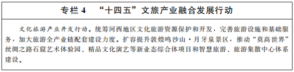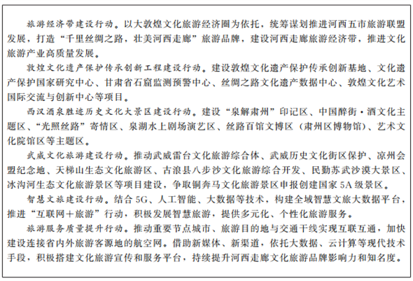 (四)合力做強文旅產(chǎn)業(yè)。 共筑文化發(fā)展高地。以敦煌為龍頭,以河西走廊整體聯(lián)動發(fā)展為關(guān)鍵,打造“一帶一路”文化產(chǎn)業(yè)高地,推動文化資源優(yōu)化配置,全面提升區(qū)域文化影響力。依托長征國家文化公園、長城國家文化公園、黃河國家文化公園、河西走廊國家遺產(chǎn)線路綜合保護利用工程、敦煌文化遺產(chǎn)保護傳承創(chuàng)新工程等建設(shè)項目,打造絲綢之路沿線區(qū)域特色文化品牌。實施文化產(chǎn)業(yè)孵化工程,加強文化科技示范基地建設(shè),推動區(qū)域文化產(chǎn)業(yè)帶建設(shè)。 推進文化旅游深度融合。以大敦煌文化旅游經(jīng)濟圈建設(shè)為抓手,打造全省文化旅游產(chǎn)業(yè)鏈的核心依托和重要增長極。通過深度開發(fā)文旅資源,整合優(yōu)化產(chǎn)業(yè)布局,完善提升基礎(chǔ)設(shè)施,開拓特色旅游線路,提升旅游產(chǎn)品質(zhì)量,豐富旅游消費供給,帶動河西走廊經(jīng)濟帶乃至全省文旅產(chǎn)業(yè)融合發(fā)展。統(tǒng)籌謀劃推進河西五市旅游聯(lián)盟發(fā)展,加強與新疆、青海、內(nèi)蒙古、陜西、寧夏等省區(qū)合作,建立客源互送、線路串聯(lián)、資源共享旅游合作機制,推動大敦煌與西部省市區(qū)多圈層合作,打造文旅康養(yǎng)深度融合發(fā)展示范區(qū)。 共建世界知名旅游目的地。聯(lián)動挖掘河西走廊深厚的歷史文化底蘊和豐厚的旅游資源,提升絲綢之路黃金文化旅游帶的輻射帶動力。重點打造以石窟文化、長城文化、紅色文化等為代表的歷史文化旅游目的地,建設(shè)以大漠風(fēng)情、丹霞地貌、祁連風(fēng)光等為特色的生態(tài)風(fēng)情游目的地,建設(shè)以中國載人航天發(fā)射、玉門百年油田、甘肅清潔能源基地為基礎(chǔ)的現(xiàn)代科技旅游目的地。