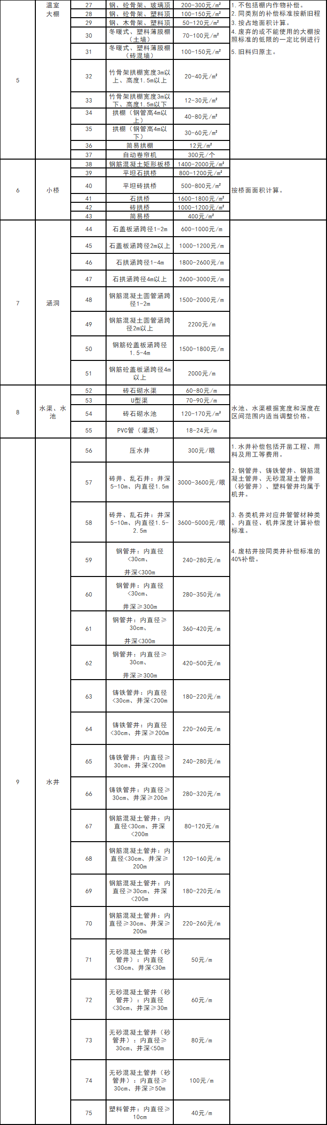 說明: 1.表中未列出的地上附著物,參照表中相近的補(bǔ)償標(biāo)準(zhǔn)補(bǔ)償;不能參照的,可委托具有資質(zhì)的評估機(jī)構(gòu)進(jìn)行評估確定。 2.當(dāng)?shù)卣當(dāng)M征地公告發(fā)布后開始搶種、搶栽以及搶建的建筑物、構(gòu)筑物等不予補(bǔ)償。 3.上述項(xiàng)目中涉及到政府投資建設(shè)的不在補(bǔ)償范圍內(nèi)。 4.國家和省確定的鐵路、公路、機(jī)場、航道港口、水利工程、能源工程等重大基礎(chǔ)設(shè)施項(xiàng)目征收土地地上附著物和青苗補(bǔ)償?shù)葮?biāo)準(zhǔn)另有規(guī)定的,從其規(guī)定。