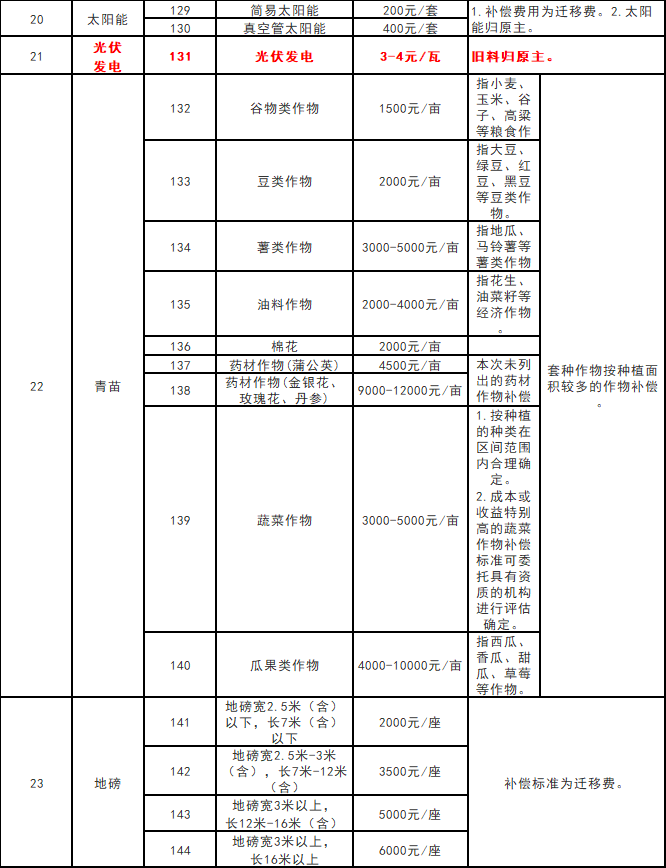 近日,山東省自然資源廳、省財(cái)政廳正式出臺聊城市關(guān)于征地地上附著物和青苗補(bǔ)償標(biāo)準(zhǔn)。新一輪《聊城市征地地上附著物和青苗補(bǔ)償標(biāo)準(zhǔn)》,包括房屋等23大類,144小類;較上一輪標(biāo)準(zhǔn)平均提升了19.01%。其中:光伏發(fā)電按照3-4元/瓦進(jìn)行補(bǔ)償,拆卸舊料歸原主。 原文如下: 山東省自然資源廳 山東省財(cái)政廳 關(guān)于聊城市征地地上附著物和青苗補(bǔ)償標(biāo)準(zhǔn)的批復(fù) 聊城市自然資源和規(guī)劃局、財(cái)政局: 你市《關(guān)于調(diào)整征地地上附著物和青苗補(bǔ)償標(biāo)準(zhǔn)的請示》(聊自然資規(guī)呈〔2022〕1號)收悉。經(jīng)研究,同意你市制定的征地地上附著物和青苗補(bǔ)償標(biāo)準(zhǔn)(詳見附件)。 標(biāo)準(zhǔn)自批復(fù)之日起執(zhí)行。 附件:聊城市征地地上附著物和青苗補(bǔ)償標(biāo)準(zhǔn) 山東省自然資源廳 山東省財(cái)政廳 2022年1月8日 附件 聊城市征地地上附著物和青苗補(bǔ)償標(biāo)準(zhǔn)