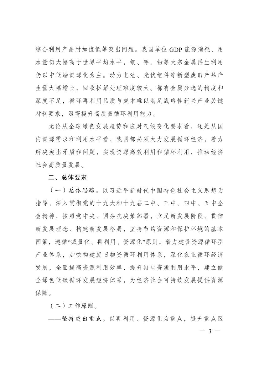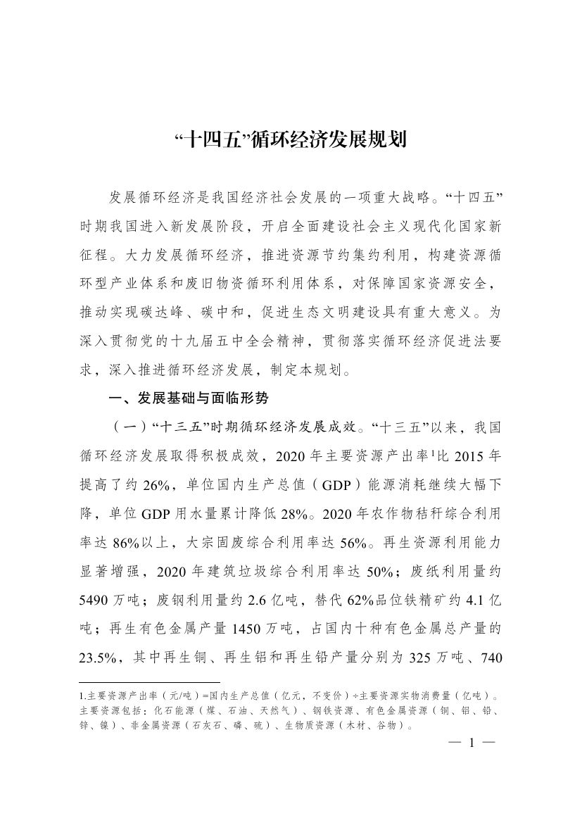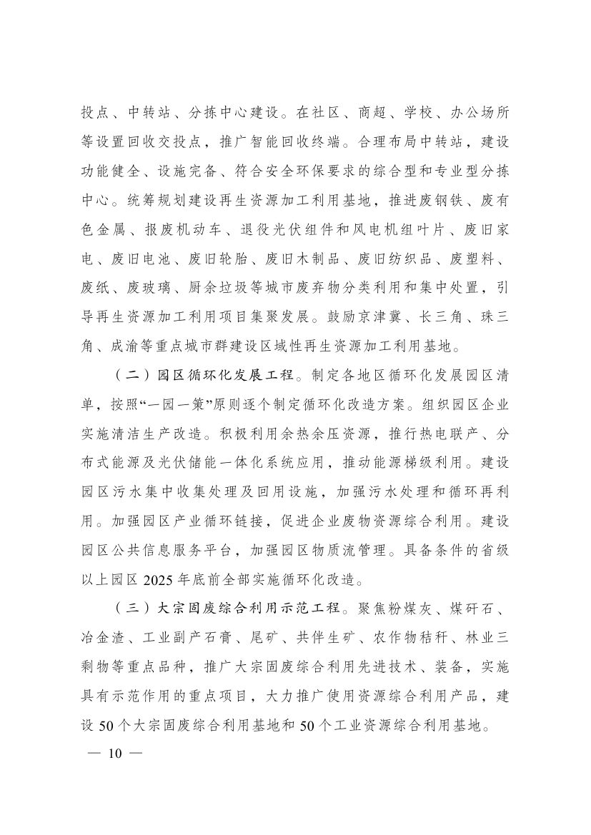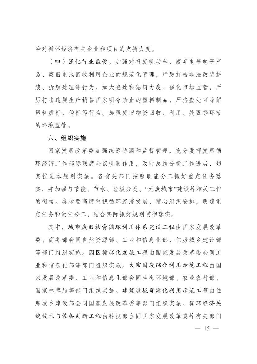 近日,國(guó)家發(fā)展改革委關(guān)于印發(fā)“十四五”循環(huán)經(jīng)濟(jì)發(fā)展規(guī)劃的通知,規(guī)劃提出,制定各地區(qū)循環(huán)化發(fā)展園區(qū)清單,按照“一園一策”原則逐個(gè)制定循環(huán)化改造方案。組織園區(qū)企業(yè)實(shí)施清潔生產(chǎn)改造。積極利用余熱余壓資源,推行熱電聯(lián)產(chǎn)、分布式能源及光伏儲(chǔ)能一體化系統(tǒng)應(yīng)用,推動(dòng)能源梯級(jí)利用。加強(qiáng)園區(qū)產(chǎn)業(yè)循環(huán)鏈接,促進(jìn)企業(yè)廢物資源綜合利用。建設(shè)園區(qū)公共信息服務(wù)平臺(tái),加強(qiáng)園區(qū)物質(zhì)流管理。具備條件的省級(jí)以上園區(qū)2025年底前全部實(shí)施循環(huán)化改造。 原文如下: 國(guó)家發(fā)展改革委關(guān)于印發(fā)“十四五”循環(huán)經(jīng)濟(jì)發(fā)展規(guī)劃的通知 發(fā)改環(huán)資〔2021〕969號(hào) 各省、自治區(qū)、直轄市人民政府,科技部、工業(yè)和信息化部、公安部、財(cái)政部、自然資源部、生態(tài)環(huán)境部、住房城鄉(xiāng)建設(shè)部、交通運(yùn)輸部、水利部、農(nóng)業(yè)農(nóng)村部、商務(wù)部、國(guó)務(wù)院國(guó)資委、海關(guān)總署、稅務(wù)總局、市場(chǎng)監(jiān)管總局、國(guó)家統(tǒng)計(jì)局、銀保監(jiān)會(huì)、國(guó)家林草局、國(guó)家郵政局、供銷合作總社: 《“十四五”循環(huán)經(jīng)濟(jì)發(fā)展規(guī)劃》已經(jīng)國(guó)務(wù)院同意,現(xiàn)印發(fā)給你們,請(qǐng)結(jié)合實(shí)際抓好貫徹落實(shí)。 國(guó)家發(fā)展改革委 2021年7月1日