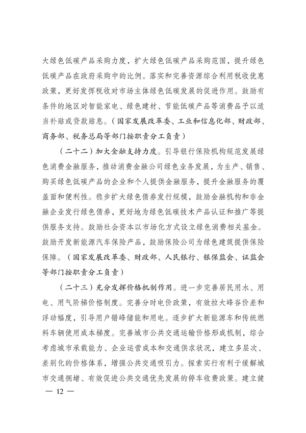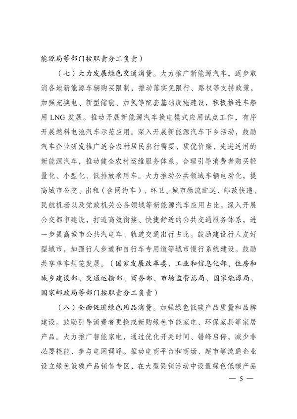 1月21日,國(guó)家發(fā)改委等7部委印發(fā)《促進(jìn)綠色消費(fèi)實(shí)施方案》,方案提出,大力推廣新能源汽車,逐步取消各地新能源車輛購(gòu)買限制,推動(dòng)落實(shí)免限行、路權(quán)等支持政策, 加強(qiáng)充換電、新型儲(chǔ)能、加氫等配套基礎(chǔ)設(shè)施建設(shè),積極推進(jìn)車船用LNG發(fā)展。推動(dòng)開展新能源汽車換電模式應(yīng)用試點(diǎn)工作,有序開展燃料電池汽車示范應(yīng)用。完善分時(shí)電價(jià)政策,有效拉大峰谷價(jià)差和浮動(dòng)幅度,引導(dǎo)用戶錯(cuò)峰儲(chǔ)能和用電。 國(guó)家發(fā)展改革委等部門關(guān)于印發(fā)《促進(jìn)綠色消費(fèi)實(shí)施方案》的通知 發(fā)改就業(yè)〔2022〕107號(hào) 中央和國(guó)家機(jī)關(guān)有關(guān)部門、有關(guān)直屬機(jī)構(gòu),全國(guó)總工會(huì)、全國(guó)婦聯(lián),各省、自治區(qū)、直轄市及計(jì)劃單列市、新疆生產(chǎn)建設(shè)兵團(tuán)發(fā)展改革委、工業(yè)和信息化主管部門、住房和城鄉(xiāng)建設(shè)廳(委、管委、局)、商務(wù)主管部門、市場(chǎng)監(jiān)管局(廳、委)、機(jī)關(guān)事務(wù)管理局: 為深入貫徹落實(shí)《中共中央、國(guó)務(wù)院關(guān)于完整準(zhǔn)確全面貫徹新發(fā)展理念做好碳達(dá)峰碳中和工作的意見》和《2030年前碳達(dá)峰行動(dòng)方案》有關(guān)要求,根據(jù)碳達(dá)峰碳中和工作領(lǐng)導(dǎo)小組部署安排,國(guó)家發(fā)展改革委、工業(yè)和信息化部、住房和城鄉(xiāng)建設(shè)部、商務(wù)部、市場(chǎng)監(jiān)管總局、國(guó)管局、中直管理局會(huì)同有關(guān)部門研究制定了《促進(jìn)綠色消費(fèi)實(shí)施方案》。現(xiàn)印發(fā)給你們,請(qǐng)結(jié)合實(shí)際,認(rèn)真抓好貫徹落實(shí)。 國(guó)家發(fā)展改革委 工業(yè)和信息化部 住房和城鄉(xiāng)建設(shè)部 商 務(wù) 部 市場(chǎng)監(jiān)管總局 國(guó) 管 局 中 直 管 理 局 2022年1月18日