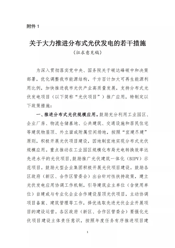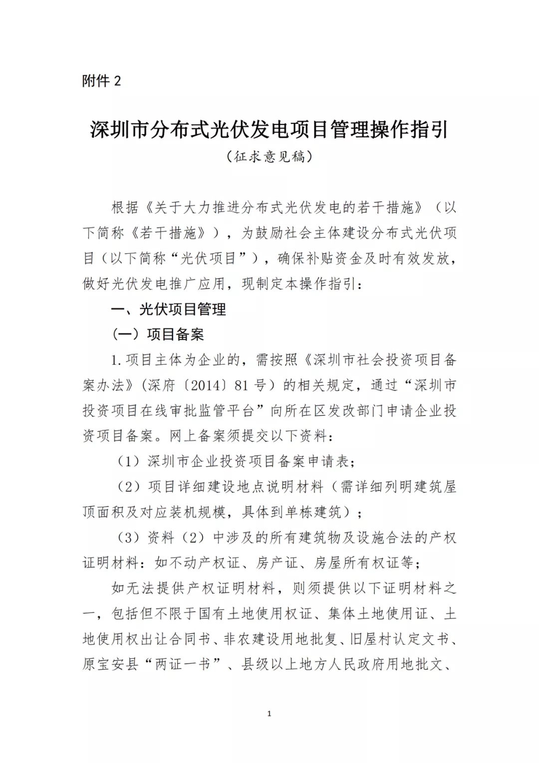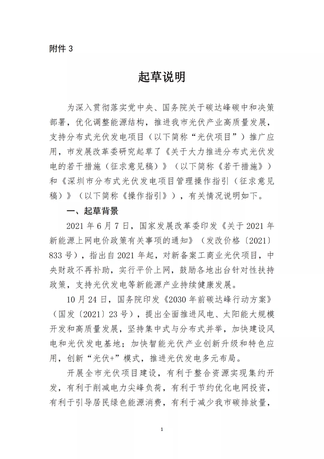 全文如下: 深圳市發(fā)展和改革委員會關(guān)于公開征求《關(guān)于大力推進(jìn)分布式光伏發(fā)電的若干措施(征求意見稿)》和《深圳市分布式光伏發(fā)電項目管理操作指引(征求意見稿)》意見的通告 為深入貫徹落實黨中央、國務(wù)院關(guān)于碳達(dá)峰碳中和決策部署,優(yōu)化調(diào)整我市能源結(jié)構(gòu),千方百計加大可再生能源利用比例,加快推進(jìn)我市光伏產(chǎn)業(yè)高質(zhì)量發(fā)展,支持分布式光伏發(fā)電項目推廣應(yīng)用,我委編制了《關(guān)于大力推進(jìn)分布式光伏發(fā)電的若干措施(征求意見稿)》和《深圳市分布式光伏發(fā)電項目管理操作指引(征求意見稿)》,現(xiàn)向社會公開征求意見。各單位和公眾可于2022年2月24日前將有關(guān)意見發(fā)送至郵箱sznyxx@fgw.sz.gov.cn或郵寄至深圳市福田區(qū)福中三路市民中心B區(qū)行政服務(wù)大廳市發(fā)展改革委窗口。 特此通告。 附件: 1.關(guān)于大力推進(jìn)分布式光伏發(fā)電的若干措施(征求意見稿) 2.深圳市分布式光伏發(fā)電項目管理操作指引(征求意見稿) 3.起草說明 深圳市發(fā)展和改革委員會 2022年1月21日