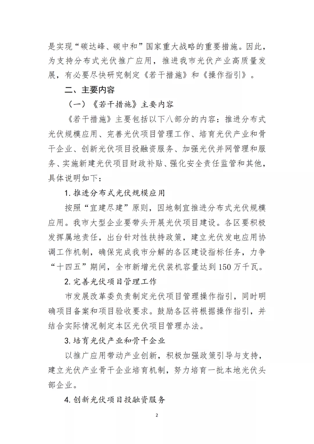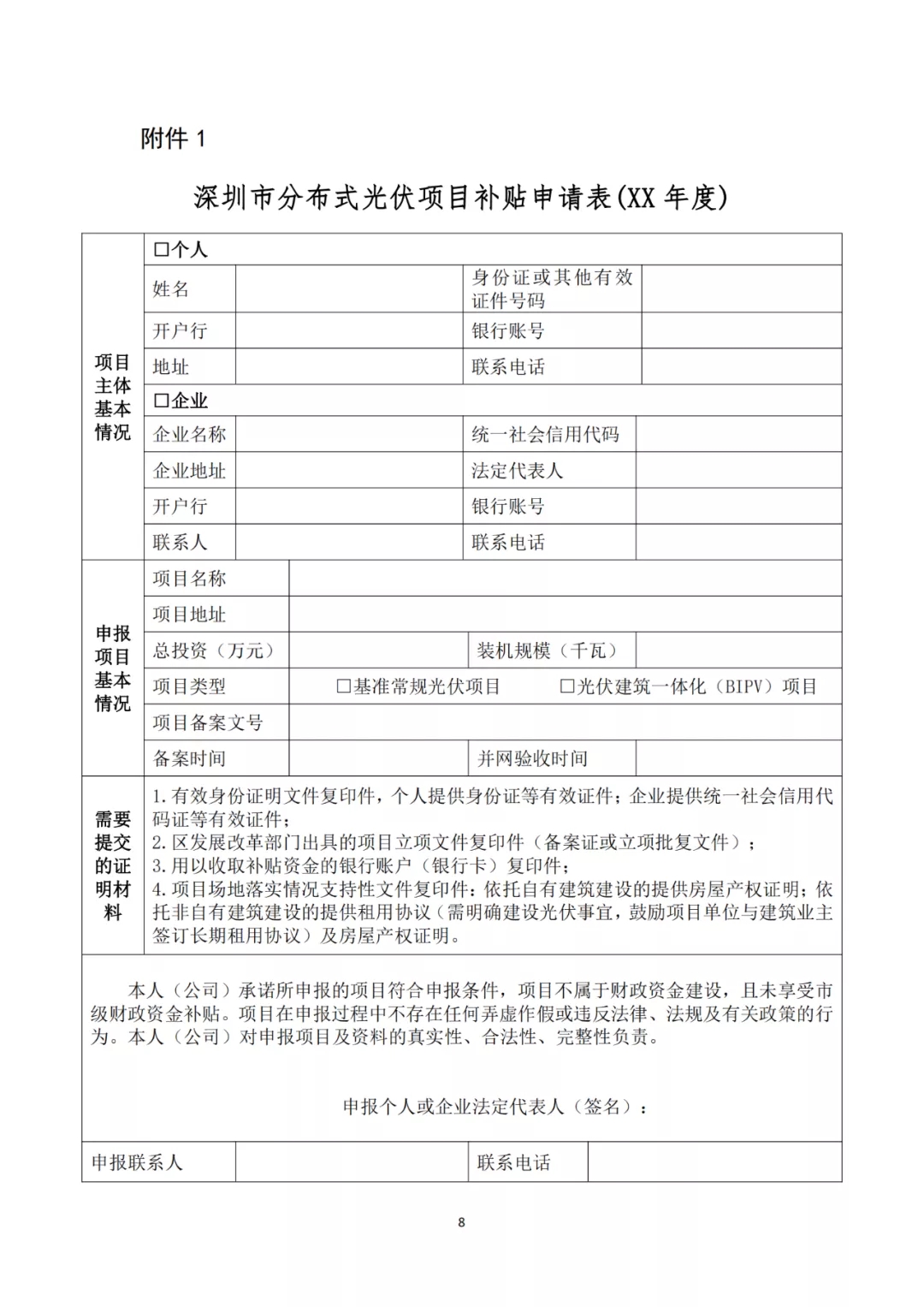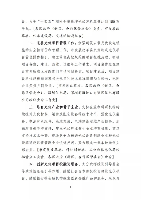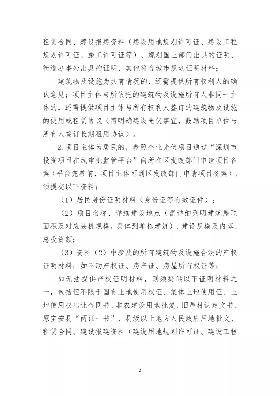 全文如下: 深圳市發(fā)展和改革委員會關(guān)于公開征求《關(guān)于大力推進(jìn)分布式光伏發(fā)電的若干措施(征求意見稿)》和《深圳市分布式光伏發(fā)電項目管理操作指引(征求意見稿)》意見的通告 為深入貫徹落實黨中央、國務(wù)院關(guān)于碳達(dá)峰碳中和決策部署,優(yōu)化調(diào)整我市能源結(jié)構(gòu),千方百計加大可再生能源利用比例,加快推進(jìn)我市光伏產(chǎn)業(yè)高質(zhì)量發(fā)展,支持分布式光伏發(fā)電項目推廣應(yīng)用,我委編制了《關(guān)于大力推進(jìn)分布式光伏發(fā)電的若干措施(征求意見稿)》和《深圳市分布式光伏發(fā)電項目管理操作指引(征求意見稿)》,現(xiàn)向社會公開征求意見。各單位和公眾可于2022年2月24日前將有關(guān)意見發(fā)送至郵箱sznyxx@fgw.sz.gov.cn或郵寄至深圳市福田區(qū)福中三路市民中心B區(qū)行政服務(wù)大廳市發(fā)展改革委窗口。 特此通告。 附件: 1.關(guān)于大力推進(jìn)分布式光伏發(fā)電的若干措施(征求意見稿) 2.深圳市分布式光伏發(fā)電項目管理操作指引(征求意見稿) 3.起草說明 深圳市發(fā)展和改革委員會 2022年1月21日