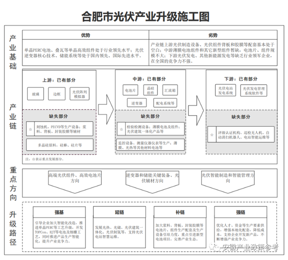 (四)加快延鏈補鏈強鏈 著眼光伏及新能源前景光明、光伏應(yīng)用進入平價上網(wǎng)時代、產(chǎn)業(yè)技術(shù)迭代周期短、項目資金投入大等特點,搶抓機遇、乘勢而上,做好延鏈、補鏈、強鏈,確保產(chǎn)業(yè)鏈供應(yīng)鏈穩(wěn)定。 1.延鏈。堅持應(yīng)用拉動,拓展“光伏+”各領(lǐng)域應(yīng)用場景,積極推進光伏+儲能、光伏+制氫、光伏+5G通信等試點示范。圍繞產(chǎn)業(yè)鏈上下游環(huán)節(jié)、產(chǎn)供銷體系,推動產(chǎn)業(yè)鏈同城采購,幫助企業(yè)推廣新產(chǎn)品新技術(shù)。繼續(xù)鼓勵優(yōu)勢企業(yè)實施“走出去”戰(zhàn)略,積極響應(yīng)“一帶一路”倡議,開拓“一帶一路”沿線國家及全球海外市場,在全球范圍內(nèi)培育打造合肥光伏產(chǎn)業(yè)的品牌和形象。 2.補鏈。圍繞產(chǎn)業(yè)鏈缺失的中下游環(huán)節(jié),開展點對點精準(zhǔn)招商,重點招引漿料、背板、封裝膠膜、設(shè)備制造、光伏建筑一體化產(chǎn)品制造等環(huán)節(jié)。推進IGBT等逆變器關(guān)鍵元器件國產(chǎn)化替代,招引培育MOSFET(金屬氧化物場效應(yīng)晶體管)、GTO(可關(guān)斷晶閘管)等半導(dǎo)體器件研發(fā)生產(chǎn)企業(yè);積極引進相關(guān)檢驗檢測及認(rèn)證機構(gòu),提升產(chǎn)業(yè)配套、降低生產(chǎn)成本,完善產(chǎn)業(yè)生態(tài)。 3.強鏈。壯大光伏企業(yè)整體實力,形成一批具有生態(tài)主導(dǎo)能力的產(chǎn)業(yè)鏈“鏈主”企業(yè),打造“大而強”、“中而優(yōu)”和“小而美”的產(chǎn)業(yè)梯隊。鼓勵頭部企業(yè)加大在肥投資力度,進一步壯大產(chǎn)業(yè)規(guī)模。加快培育重點企業(yè),遴選培育產(chǎn)業(yè)鏈領(lǐng)航企業(yè)、龍頭骨干企業(yè),大力培育“專精特新”企業(yè),研究建立產(chǎn)業(yè)鏈創(chuàng)新型企業(yè)庫,支持重點企業(yè)開拓市場、擴大規(guī)模,提升技術(shù)創(chuàng)新能力。培育一批科技創(chuàng)新型企業(yè),針對具有自主知識產(chǎn)權(quán)、研發(fā)基礎(chǔ)好、技術(shù)創(chuàng)新能力強、行業(yè)領(lǐng)先的科技創(chuàng)新型光伏龍頭企業(yè),從科技攻關(guān)、研發(fā)平臺、人才引進、綠色改造、市場拓展等方面采取“一企一策”方式予以支持,推動企業(yè)技術(shù)創(chuàng)新與管理創(chuàng)新、組織創(chuàng)新和商業(yè)模式創(chuàng)新深度融合,提升企業(yè)核心競爭力。 (五)創(chuàng)新光伏應(yīng)用模式 推進光伏在經(jīng)濟社會發(fā)展中的深度應(yīng)用與示范,重點推進光伏建筑及社區(qū)、智能光伏電站、光伏+5G、光伏+儲能+充電等應(yīng)用示范,開創(chuàng)合肥光伏推廣應(yīng)用新局面。 1.屋頂分布式光伏應(yīng)用示范。鼓勵具備條件的縣(市)區(qū)按照國家相關(guān)部門部署,加大屋頂光伏開發(fā)鼓勵和推進力度,整合資源、節(jié)約開發(fā),開展整縣(市)區(qū)推進屋頂分布式光伏建設(shè)。鼓勵優(yōu)勢地區(qū)按照相關(guān)政策要求,積極組織屋頂光伏開發(fā)分布式發(fā)電市場化交易。 2.光伏+5G應(yīng)用示范。鼓勵相關(guān)光伏應(yīng)用企業(yè)緊跟合肥市5G基站建設(shè)安排,積極開展光伏+5G應(yīng)用示范項目建設(shè)。發(fā)揮分布式光伏與5G基站電力需求相契合的優(yōu)勢,打造“光伏+5G”的合肥綠色5G應(yīng)用新模式。利用分布式光伏建設(shè)節(jié)能環(huán)保的新型綠色基站,提高5G通信基站后備供電保障能力,降低基站運營成本和生產(chǎn)電費,助力5G以更低成本、更大覆蓋、更高效率服務(wù)社會和用戶,實現(xiàn)經(jīng)濟效益、環(huán)保效益與社會效益的有機統(tǒng)一。 3.光儲充應(yīng)用示范。重點開展光伏+儲能等領(lǐng)域的研究和應(yīng)用,鼓勵光伏發(fā)電基地合理配臵儲能系統(tǒng),實現(xiàn)多能互補,提高消納能力。做大做強儲能電池生產(chǎn)制造的規(guī)模和水平,為光伏+儲能發(fā)展提供穩(wěn)定可靠的產(chǎn)業(yè)基礎(chǔ)。探索光伏與新能源汽車的跨界融合,開辟新的光伏應(yīng)用示范場景。加強充電樁、儲能、光伏電站的系統(tǒng)集成與相互融合,推動光儲充一體化應(yīng)用示范,為打造綠色城市提供整體解決方案。開展一批集光伏、儲能、充電一體化的“多站融合”項目,打造全省最大、國內(nèi)一流的光儲充應(yīng)用示范基地。 4.其他應(yīng)用示范。積極探索推動光伏“隔墻售電”,鼓勵各級各類產(chǎn)業(yè)園區(qū)、開發(fā)園區(qū)、示范園區(qū)開展智慧能源應(yīng)用示范,提升光伏發(fā)電應(yīng)用比例,促進園區(qū)綠色可持續(xù)發(fā)展。探索光伏制氫的應(yīng)用示范,加大對光伏電解水催化制氫工藝的研發(fā)和攻關(guān),重點突破光伏變功率隨機制氫技術(shù)和裝備,推進一批光伏制氫示范項目,打造國家級光伏制氫試點示范基地。繼續(xù)做好漁光互補、農(nóng)光互補等光伏應(yīng)用工程,推進一批光伏應(yīng)用示范項目,進一步擴大合肥光伏及新能源應(yīng)用領(lǐng)域和范圍。 (六)提升產(chǎn)業(yè)服務(wù)水平1.打造產(chǎn)業(yè)服務(wù)平臺 (1)匯聚創(chuàng)新創(chuàng)業(yè)要素。積極謀劃一批光伏產(chǎn)業(yè)管理、孵化、融資等支持政策,補齊短板,打造一流營商環(huán)境。加快眾創(chuàng)空間(孵化器)建