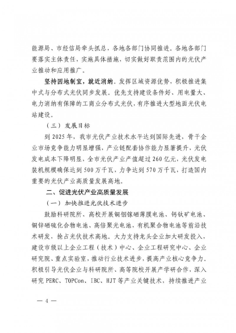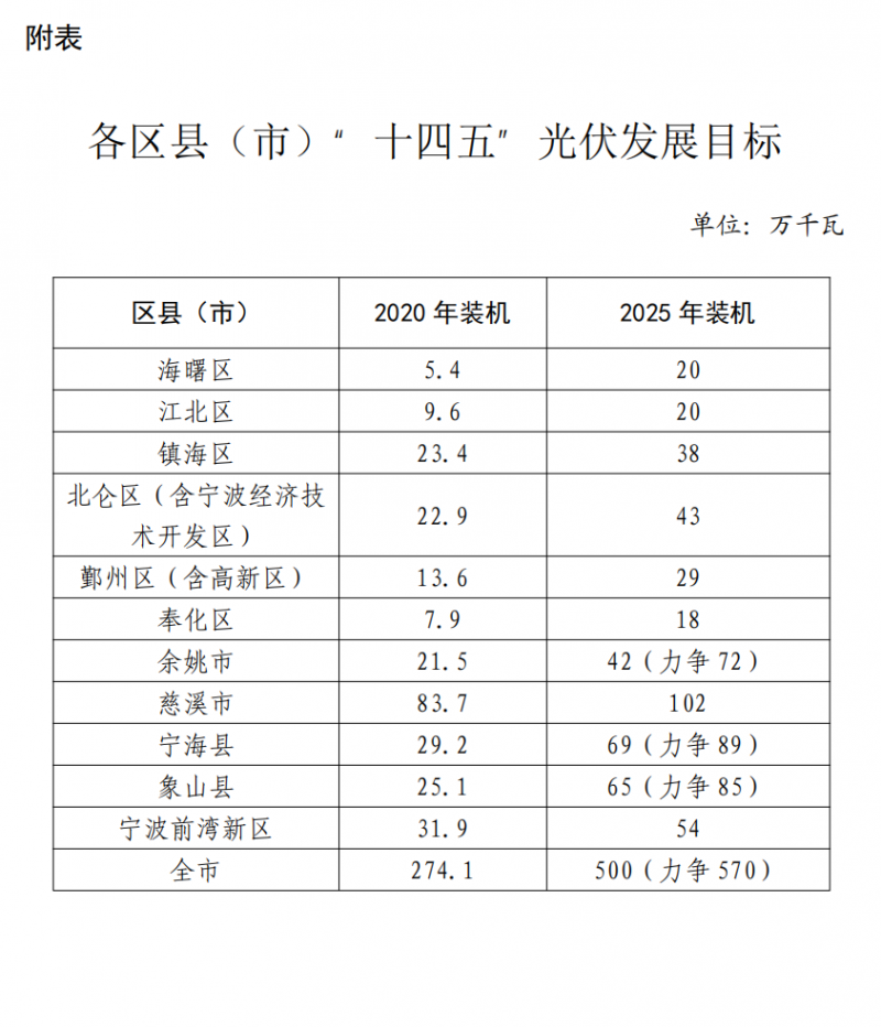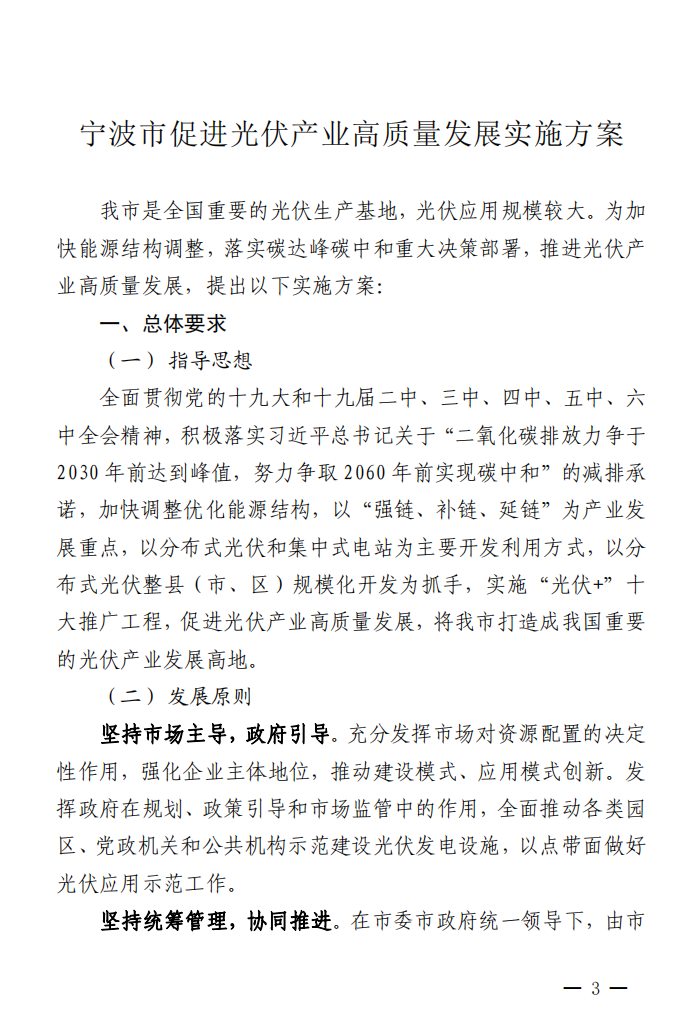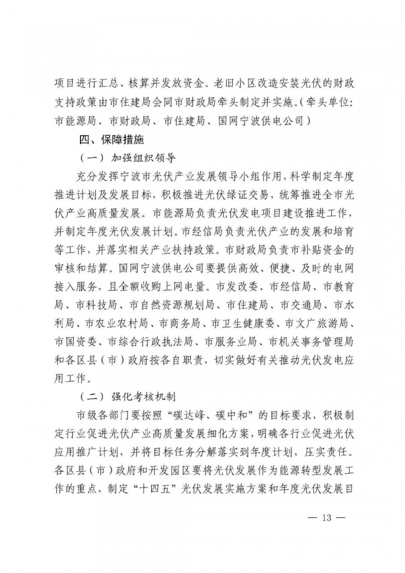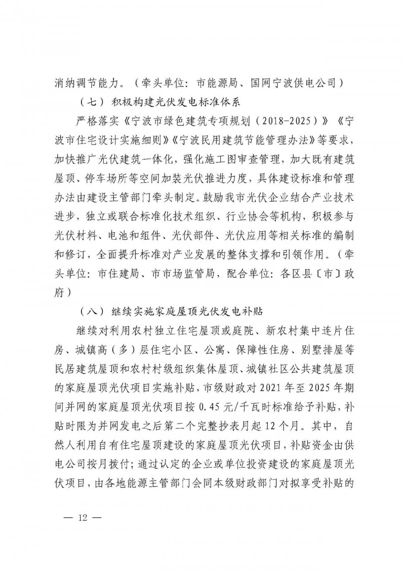 1月24日,寧波市發(fā)改委下發(fā)關(guān)于印發(fā)《寧波市促進(jìn)光伏產(chǎn)業(yè)高質(zhì)量發(fā)展實(shí)施方案》的通知。 ![]() 文件指出,到2025 年,我市光伏產(chǎn)業(yè)技術(shù)水平達(dá)到國際先進(jìn),骨干企業(yè)市場競爭能力明顯增強(qiáng),產(chǎn)業(yè)鏈配套協(xié)作能力顯著提升,光伏發(fā)電成本下降明顯,全市光伏產(chǎn)業(yè)產(chǎn)值超過260 億元,光伏發(fā)電裝機(jī)規(guī)模確保達(dá)到500 萬千瓦,力爭達(dá)到570 萬千瓦,打造國內(nèi)重要的光伏產(chǎn)業(yè)高質(zhì)量發(fā)展高地。 市級財政對 2021 年至 2025 年期 間并網(wǎng)的家庭屋頂光伏項(xiàng)目按 0.45 元/千瓦時標(biāo)準(zhǔn)給予補(bǔ)貼,補(bǔ)貼時限為并網(wǎng)發(fā)電之后第二個完整抄表月起 12 個月。 同時還提到全面推進(jìn)光伏多元化利用:實(shí)施“光伏+”十大工程,大力推進(jìn)整縣(市、區(qū))分布式光伏開發(fā),開展光伏資源排查等。
