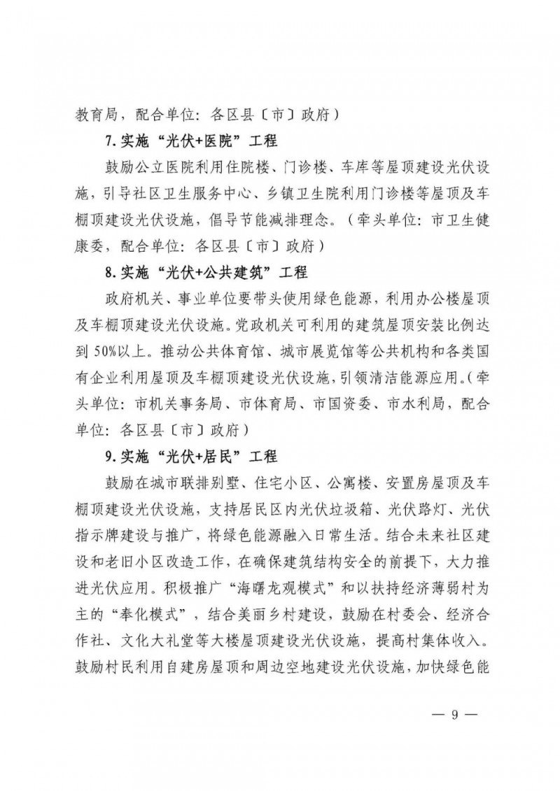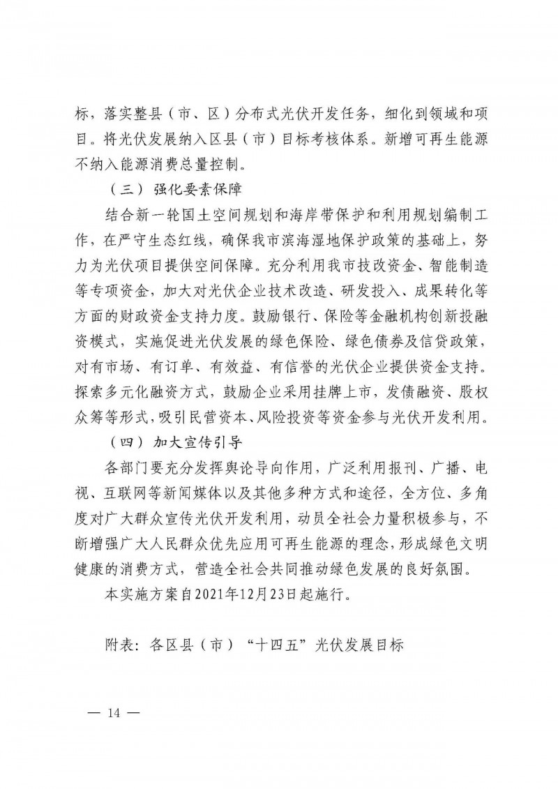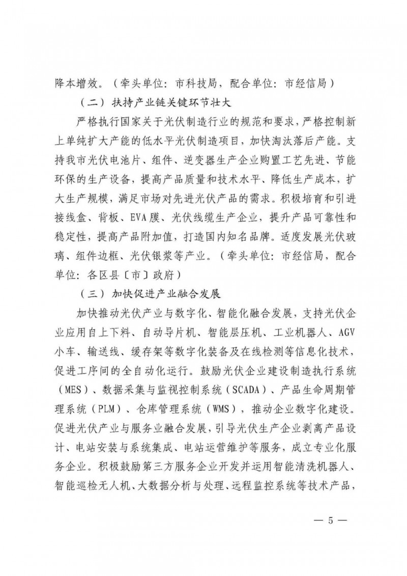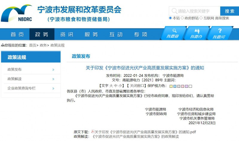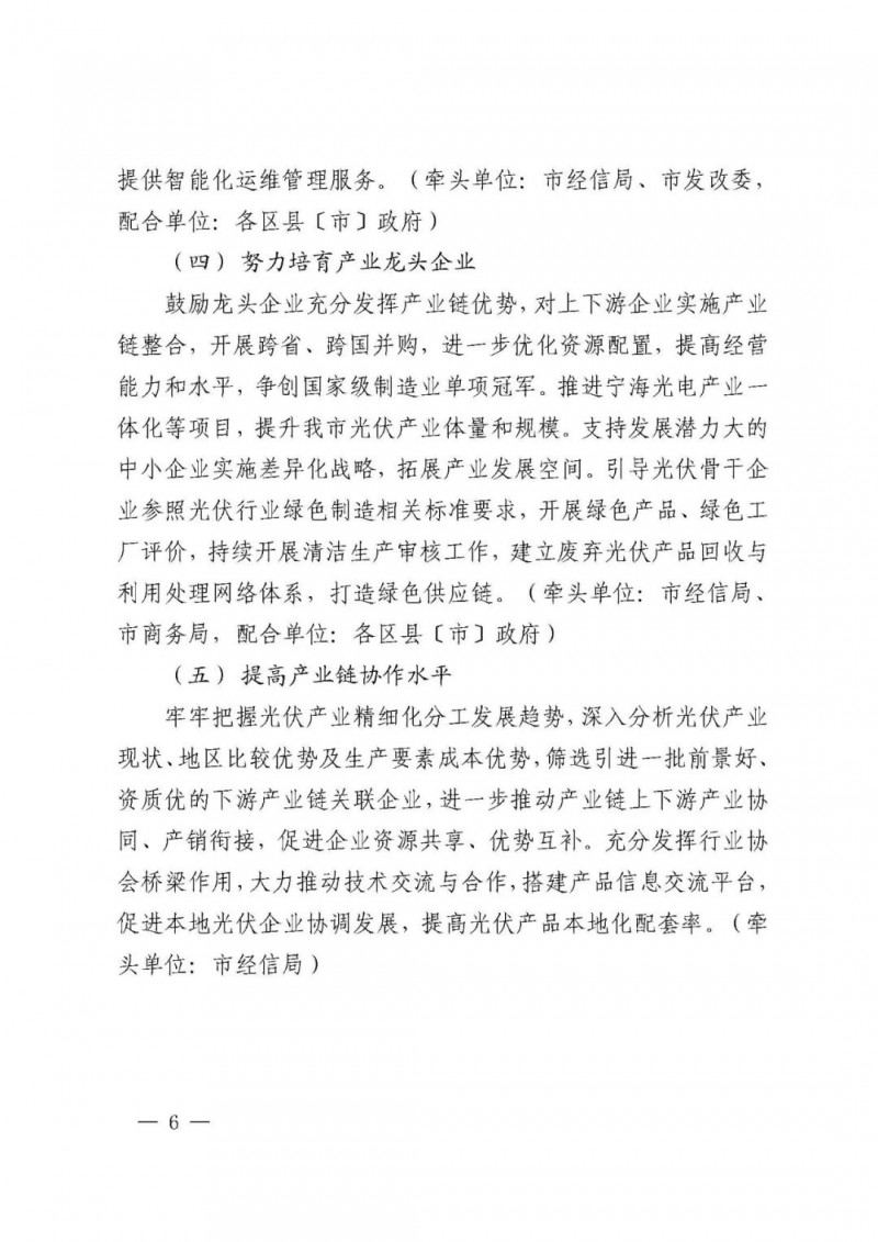 1月24日,寧波市發(fā)改委下發(fā)關(guān)于印發(fā)《寧波市促進(jìn)光伏產(chǎn)業(yè)高質(zhì)量發(fā)展實(shí)施方案》的通知。 ![]() 文件指出,到2025 年,我市光伏產(chǎn)業(yè)技術(shù)水平達(dá)到國際先進(jìn),骨干企業(yè)市場競爭能力明顯增強(qiáng),產(chǎn)業(yè)鏈配套協(xié)作能力顯著提升,光伏發(fā)電成本下降明顯,全市光伏產(chǎn)業(yè)產(chǎn)值超過260 億元,光伏發(fā)電裝機(jī)規(guī)模確保達(dá)到500 萬千瓦,力爭達(dá)到570 萬千瓦,打造國內(nèi)重要的光伏產(chǎn)業(yè)高質(zhì)量發(fā)展高地。 市級財政對 2021 年至 2025 年期 間并網(wǎng)的家庭屋頂光伏項(xiàng)目按 0.45 元/千瓦時標(biāo)準(zhǔn)給予補(bǔ)貼,補(bǔ)貼時限為并網(wǎng)發(fā)電之后第二個完整抄表月起 12 個月。 同時還提到全面推進(jìn)光伏多元化利用:實(shí)施“光伏+”十大工程,大力推進(jìn)整縣(市、區(qū))分布式光伏開發(fā),開展光伏資源排查等。