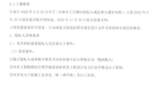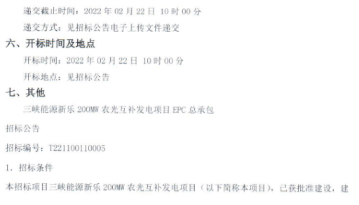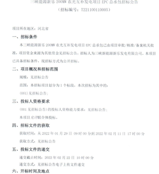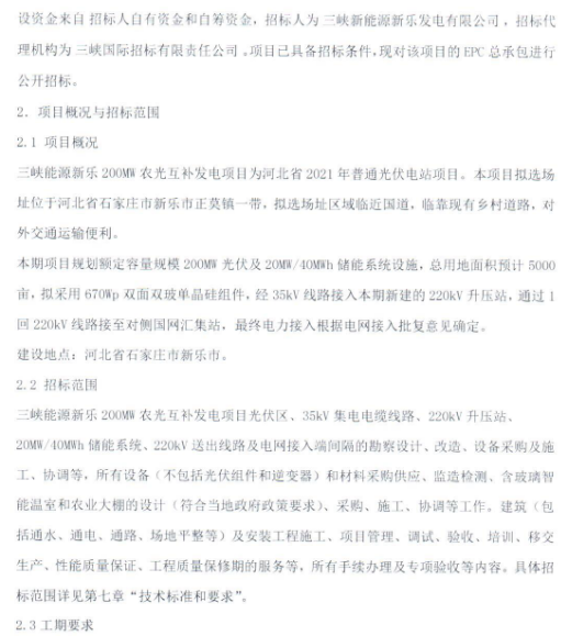 1月29日,三峽能源新樂發(fā)電有限公司發(fā)布200MW農(nóng)光互補(bǔ)發(fā)電項(xiàng)目EPC總承包招標(biāo)公告,招標(biāo)內(nèi)容包括三峽能源新樂200MW農(nóng)光互補(bǔ)發(fā)電項(xiàng)目光伏區(qū)、35kV集電電纜線路、220kV升壓站、20MW/40MWh儲(chǔ)能系統(tǒng)、220kV送出線路及電網(wǎng)接入端間隔的勘察設(shè)計(jì)、改造、設(shè)備采購及施工、協(xié)調(diào)等,所有設(shè)備(不包括光伏組件和逆變器)和材料采購供應(yīng)、監(jiān)造檢測(cè)、含玻璃智能溫室和農(nóng)業(yè)大棚的設(shè)計(jì)(符合當(dāng)?shù)卣咭?、采購、施工、協(xié)調(diào)等工作。建筑(包括通水、通電、通路、場(chǎng)地平整等)及安裝工程施工、項(xiàng)目管理、調(diào)試、驗(yàn)收、培訓(xùn)、移交生產(chǎn)、性能質(zhì)量保證、工程質(zhì)量保修期的服務(wù)等,所有手續(xù)辦理及專項(xiàng)驗(yàn)收等內(nèi)容。 原文如下: