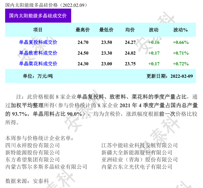 硅料價格又漲!均價漲至242.7元/kg本周國內單晶復投料價格區(qū)間在23.5-24.7萬元/噸,成交均價上漲至24.27萬元/噸,周環(huán)比漲幅為0.66%;單晶致密料價格區(qū)間在23.3-24.5萬元/噸,成交均價上漲至24.02萬元/噸,周環(huán)比漲幅為0.71%。