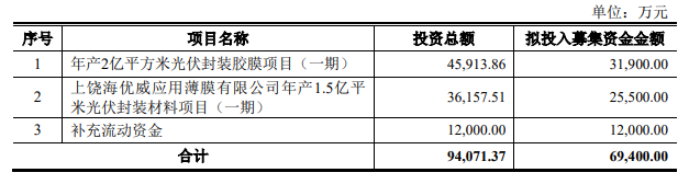 海優(yōu)新材擬投資8.2億元用于光伏封裝膠膜和材料項目2月9日,海優(yōu)新材發(fā)布公告稱,公司向不特定對象發(fā)行可轉(zhuǎn)換公司債券,擬發(fā)行可轉(zhuǎn)換公司債券總額不超過人民幣69,400.00萬元(含69,400.00萬元),扣除發(fā)行費用后的募集資金凈額將用于投入以下項目: