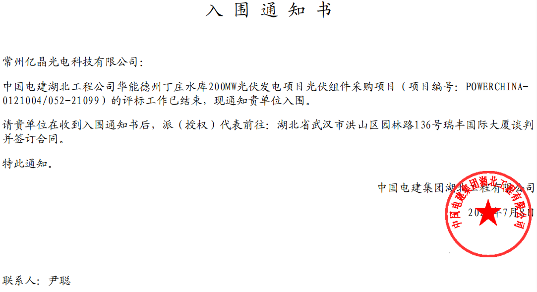 2月14日,億晶光電入圍中國(guó)電建湖北工程公司華能德州丁莊水庫(kù)200MW光伏發(fā)電項(xiàng)目光伏組件采購(gòu)項(xiàng)目。