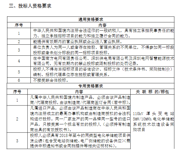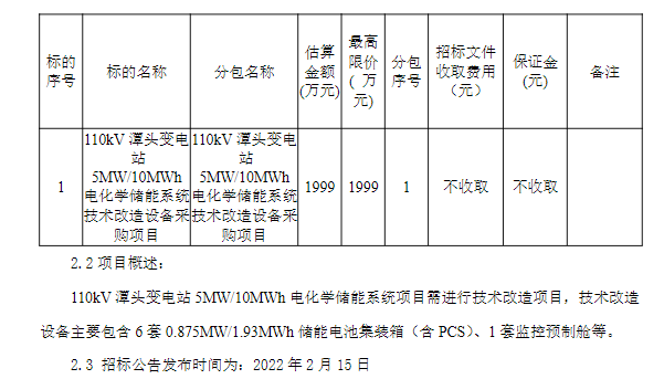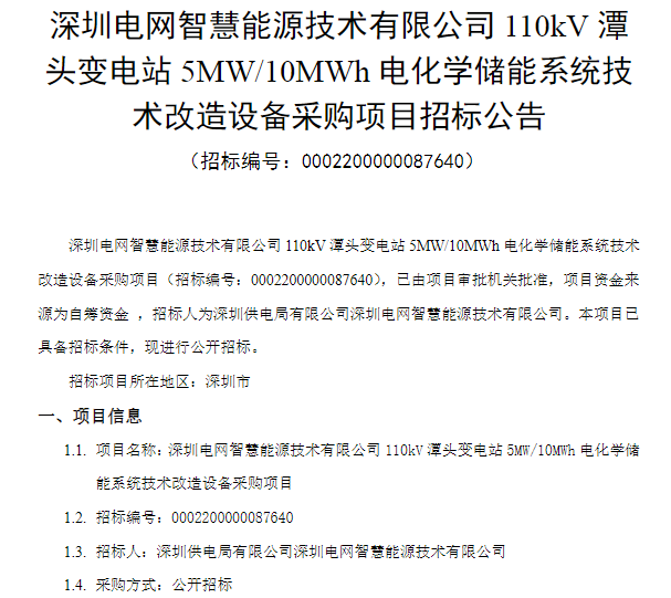 2月15日,深圳供電局有限公司深圳電網(wǎng)智慧能源技術(shù)有限公司發(fā)布110kV潭頭變電站5MW/10MWh電化學(xué)儲(chǔ)能系統(tǒng)技術(shù)改造設(shè)備采購(gòu)項(xiàng)目招標(biāo)公告,110kV潭頭變電站5MW/10MWh電化學(xué)儲(chǔ)能系統(tǒng)項(xiàng)目需進(jìn)行技術(shù)改造項(xiàng)目,技術(shù)改造設(shè)備主要包含6套0.875MW/1.93MWh儲(chǔ)能電池集裝箱(含PCS)、1套監(jiān)控預(yù)制艙等。 原文如下: