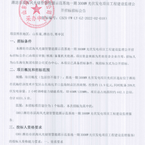 2月22日,山東海化集團(tuán)有限公司發(fā)布濰坊市濱海風(fēng)光儲(chǔ)智慧能源示范基地一期300MW光伏發(fā)電項(xiàng)目工程建設(shè)監(jiān)理公開(kāi)招標(biāo),據(jù)了解該項(xiàng)目位于濰坊市濱海經(jīng)濟(jì)技術(shù)開(kāi)發(fā)區(qū)山東?;蚩邴}場(chǎng)制鹵區(qū)西南側(cè)投資約13.9億元,同時(shí)配備20%光伏發(fā)電容量、2小時(shí)調(diào)峰能力儲(chǔ)能系統(tǒng),即60MW/120MWh。項(xiàng)目總占地面積約442.1公頃,合計(jì)6331.5畝。 原文如下: