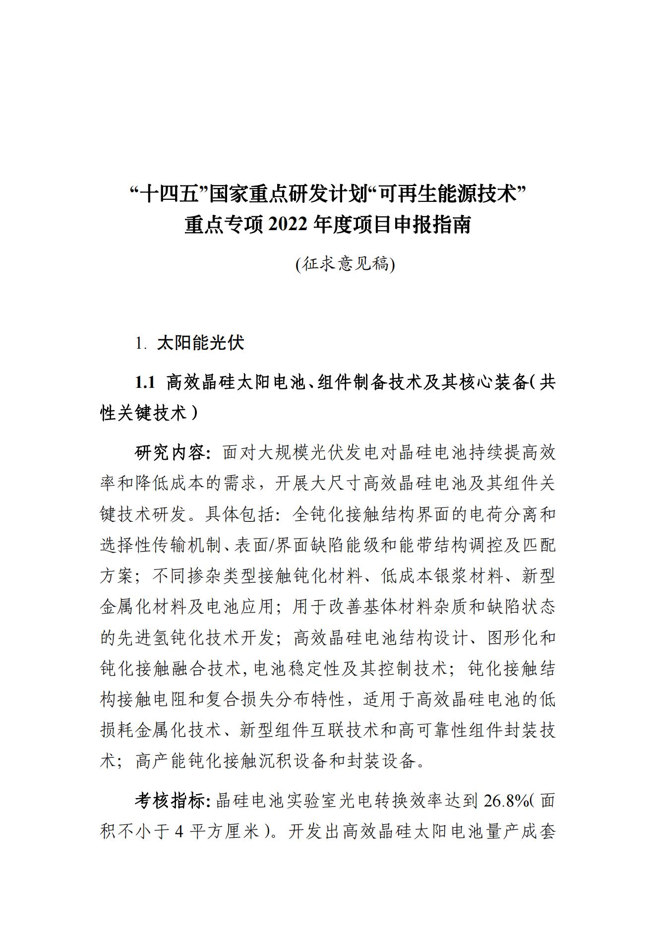 3月3日,“十四五”國家重點研發(fā)計劃24個重點專項2022年度項目申報指南征求意見稿發(fā)布,其中包含《“十四五”國家重點研發(fā)計劃“可再生能源技術(shù)”重點專項2022年度項目申報指南(征求意見稿)》。 意見稿全文如下: