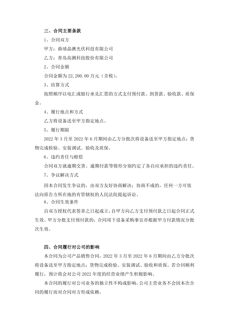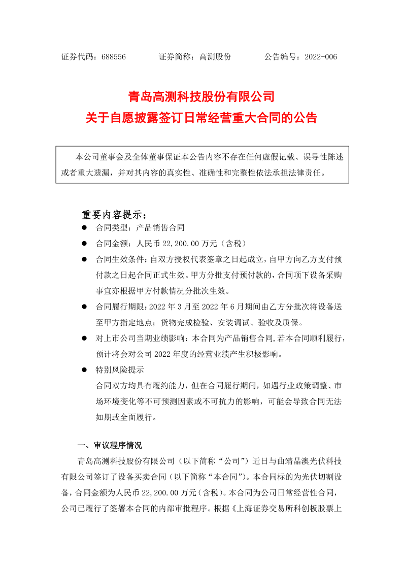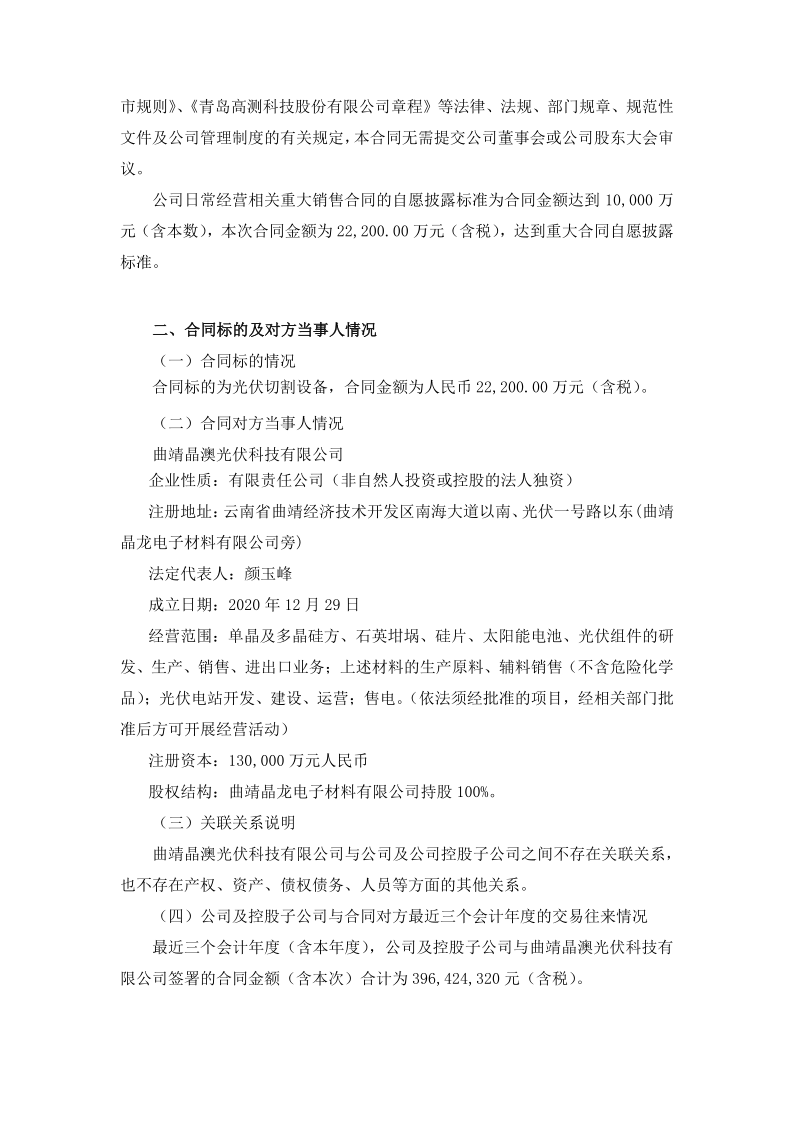 日前,高測股份發(fā)布公告稱,該公司近日與曲靖晶澳光伏科技有限公司簽訂了設備買賣合同。本合同標的為光伏切割設備,合同金額為人民幣2.22億元(含稅)。