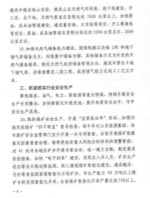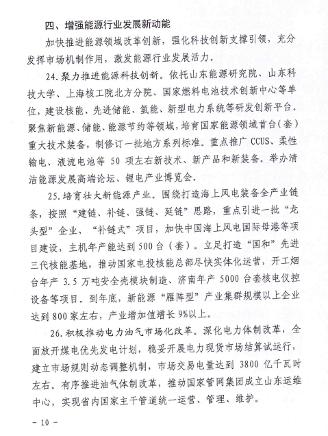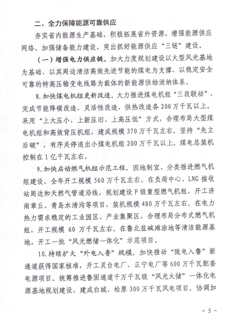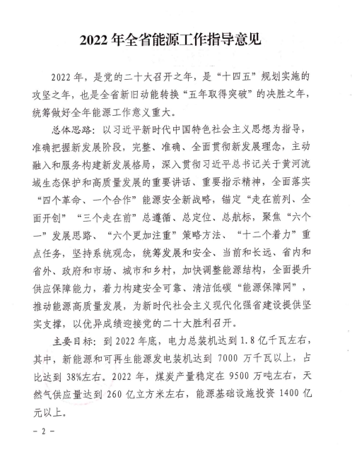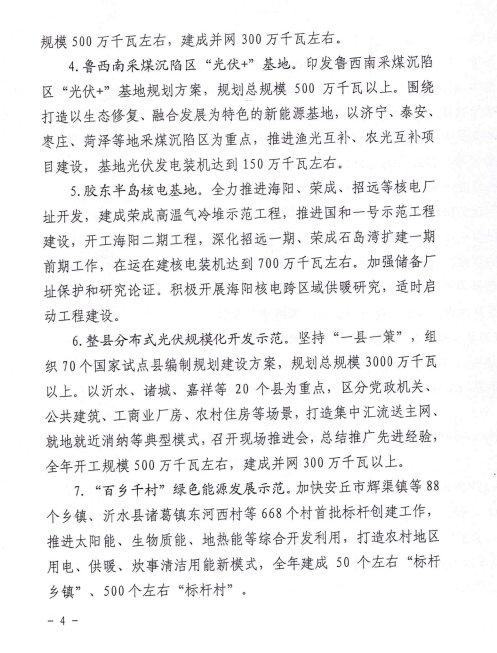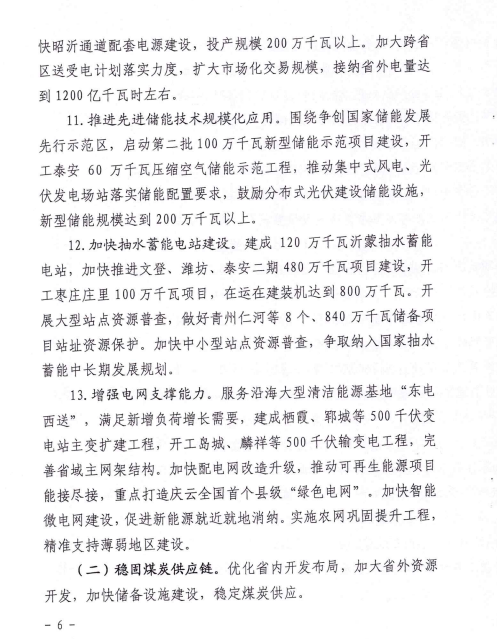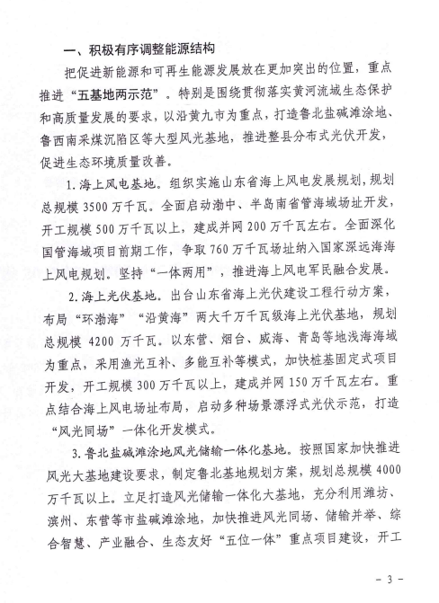 3月4日,山東省能源局關(guān)于印發(fā)2022年全省能源工作指導(dǎo)意見的通知。通知指出,山東全省能源主要發(fā)展目標(biāo):到2022年底,電力總裝機(jī)達(dá)到1.8億千瓦左右,新能源和可再生能源發(fā)電裝機(jī)達(dá)到7000萬千瓦以上,占比達(dá)到38%左右;2022年,煤炭產(chǎn)量穩(wěn)定在9500萬噸左右,天然氣供應(yīng)量260億立方米左右,能源基礎(chǔ)設(shè)施投資1400億元以上。 海上光伏基地 出臺(tái)山東省海上光伏建設(shè)工程行動(dòng)方案,布局“環(huán)渤?!薄把攸S?!眱纱笄f千瓦級(jí)海上光伏基地,規(guī)劃總規(guī)模4200萬千瓦。以東營(yíng)、煙臺(tái)、威海、青島等地淺海海域?yàn)橹攸c(diǎn),采用漁光互補(bǔ)、多能互補(bǔ)等模式,加快樁基固定式項(xiàng)目開發(fā),開工規(guī)模300萬千瓦以上,建成并網(wǎng)150萬千瓦左右。重點(diǎn)結(jié)合海上風(fēng)電場(chǎng)址布局,啟動(dòng)多種場(chǎng)景漂浮式光伏示范,打造“風(fēng)光同場(chǎng)”一體化開發(fā)模式。 魯北鹽堿灘涂地風(fēng)光儲(chǔ)輸一體化基地 按照國(guó)家加快推進(jìn)風(fēng)光大基地建設(shè)要求,制定魯北基地規(guī)劃方案,規(guī)劃總規(guī)模4000萬千瓦以上。立足打造風(fēng)光儲(chǔ)輸一體化大基地,充分利用濰坊、濱州、東營(yíng)等市鹽堿灘涂地,加快推進(jìn)風(fēng)光同場(chǎng)、儲(chǔ)輸并舉、綜合智慧、產(chǎn)業(yè)融合、生態(tài)友好“五位一體”重點(diǎn)項(xiàng)目建設(shè),開工規(guī)模500萬千瓦左右,建成并網(wǎng)300萬千瓦左右。 魯西南采煤沉陷區(qū)“光伏+”基地 印發(fā)魯西南采煤沉陷區(qū)“光伏+”基地規(guī)劃方案,規(guī)劃總規(guī)模500萬千瓦以上。圍繞打造以生態(tài)修復(fù)、融合發(fā)展為特色的新能源基地,以濟(jì)寧、泰安、棗莊、菏澤等地采煤沉陷區(qū)為重點(diǎn),推進(jìn)漁光互補(bǔ)、農(nóng)光互補(bǔ)項(xiàng)目建設(shè),基地光伏發(fā)電裝機(jī)達(dá)到150萬千瓦左右。 整縣分布式光伏規(guī)?;_發(fā)示范 堅(jiān)持“一縣一策”,組織70個(gè)國(guó)家試點(diǎn)縣編制規(guī)劃建設(shè)方案,規(guī)劃總規(guī)模3000萬千瓦以上。以沂水、諸城、嘉祥等20個(gè)縣為重點(diǎn),區(qū)分黨政機(jī)關(guān)、公共建筑、工商業(yè)廠房、農(nóng)村住房等場(chǎng)景,打造集中匯流送主網(wǎng)、就地就近消納等典型模式,召開現(xiàn)場(chǎng)推進(jìn)會(huì),總結(jié)推廣先進(jìn)經(jīng)驗(yàn),全年開工規(guī)模500萬千瓦左右,建成并網(wǎng)300萬千瓦以上。 原文如下: